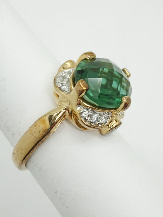 Oval Faceted Fantasy Green Stone & CZ Gold Plated Ring Size 6