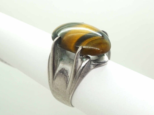 Large Oval Tiger’s Eye Cabochon Ring Solid Sterling Silver Size 10.5