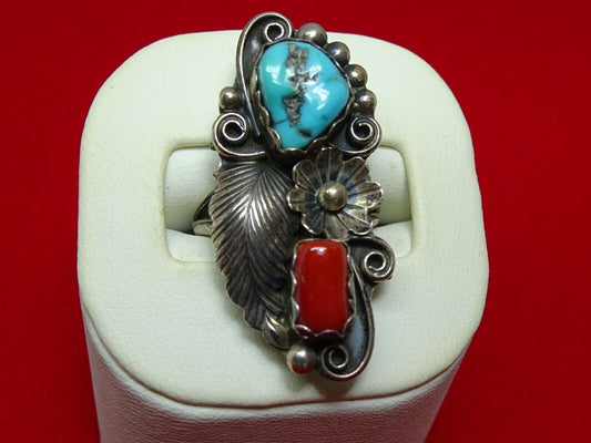 Old Pawn Native American Navajo Sterling Silver Turquoise Coral Ring, Angela Lee