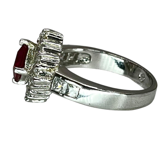 Vintage Styled Silver Tone Princess Cut Ring Cubic Zirconia Ruby Colored Stone