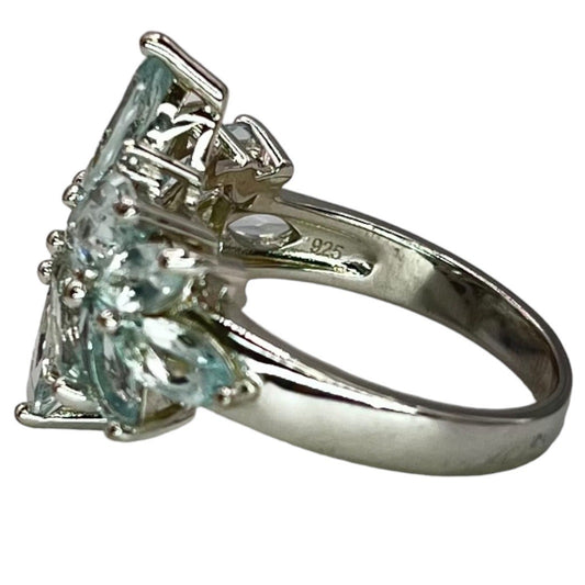 Sterling Silver Lab Aquamarine Flower Burst Sz 8 Ring Cluster Statement Cocktail