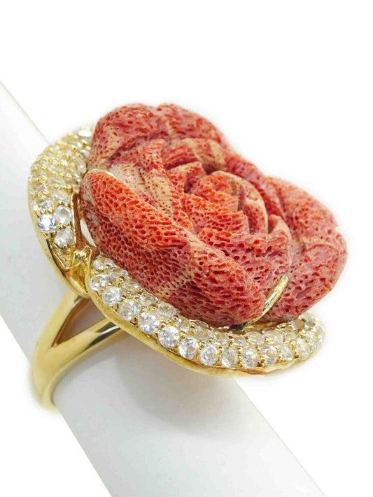 Estate Hand Carved Oxblood Red Coral & White Topaz Sterling Vermeil Ring Size 8