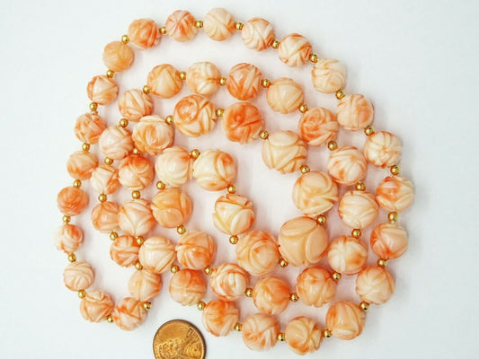 Vintage Handcarved Rose Angel Skin Coral Bead Necklace 14k Gold