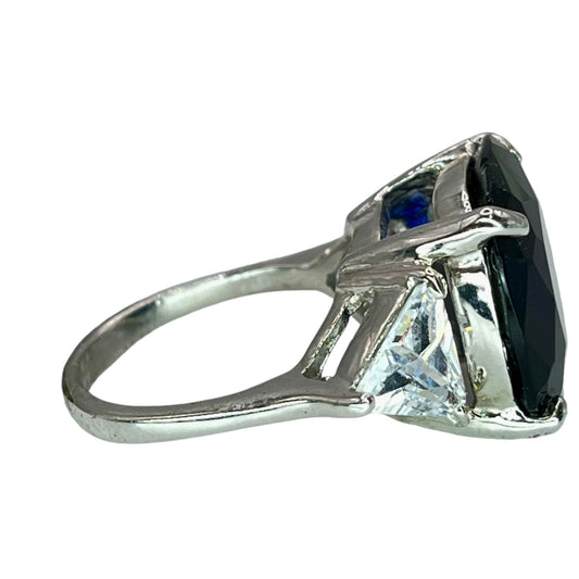 Silver Tone Faux Blue Sapphire Trillion CZ Stones Ring Size 7 Statement Chunky