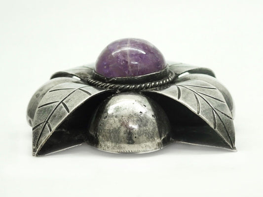 Large Amethyst Round Cabochon Flower Brooch Pin Mexico Sterling Silver
