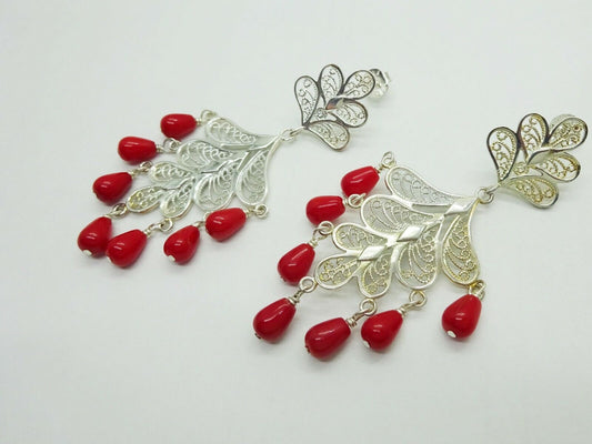 Oxblood Red Persian Coral Dangle Filigree Sterling Silver Earrings