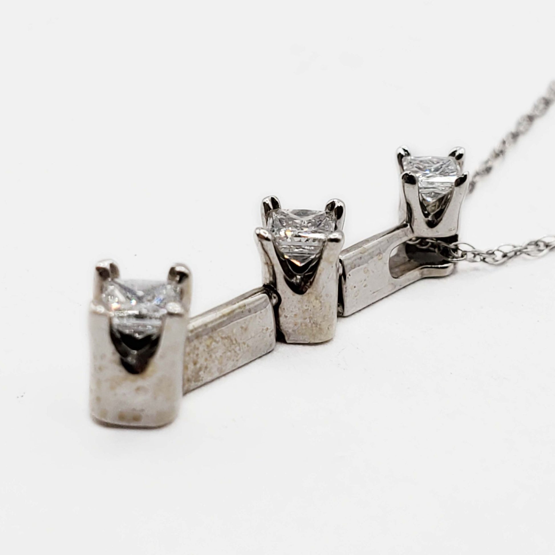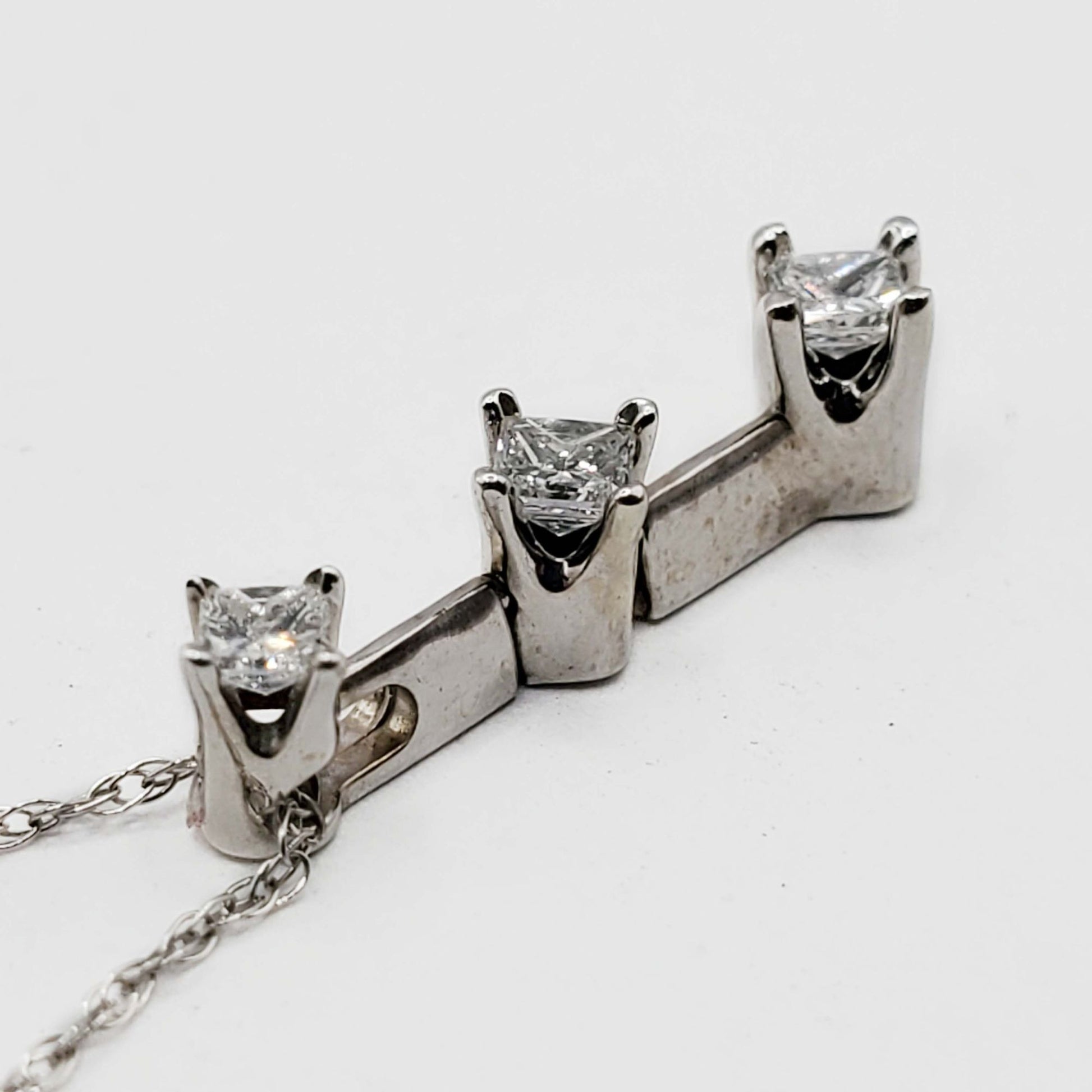A trio of natural princess-cut diamonds arranged in a 3-stone "Past Present & Future" style pendant, in 14k white gold.