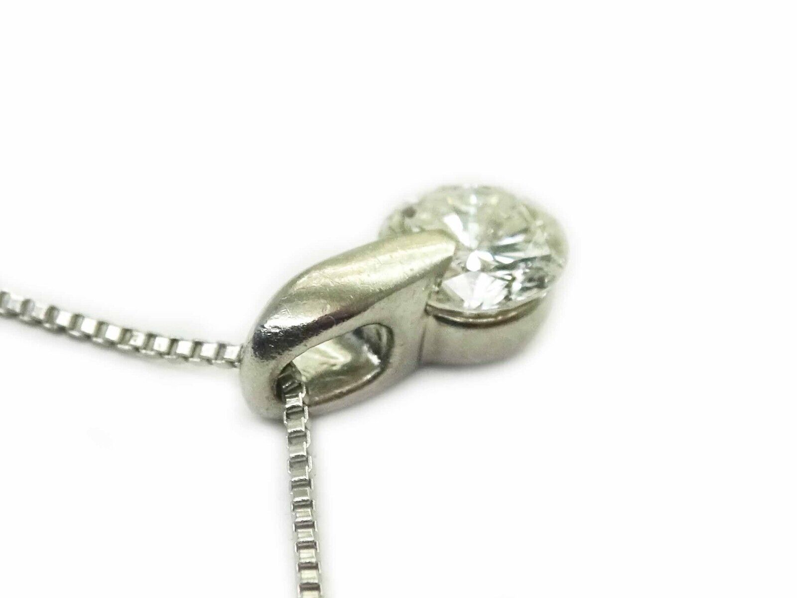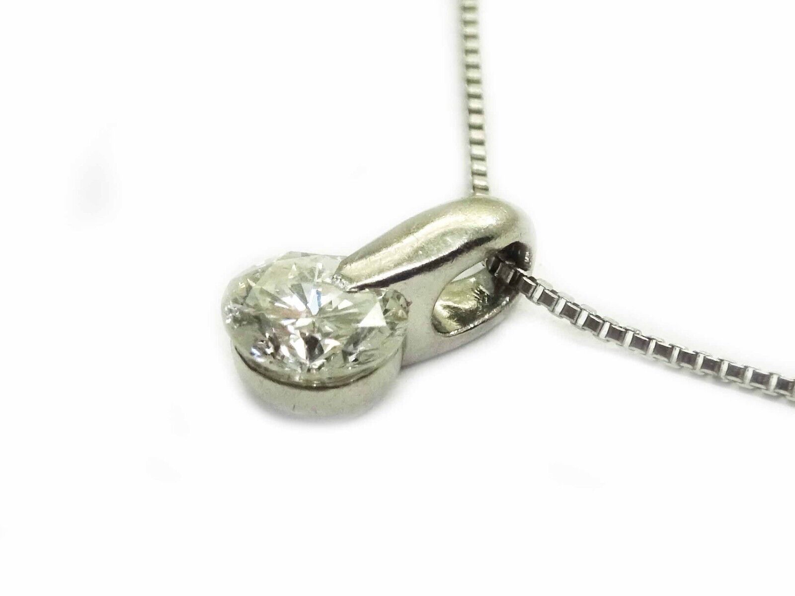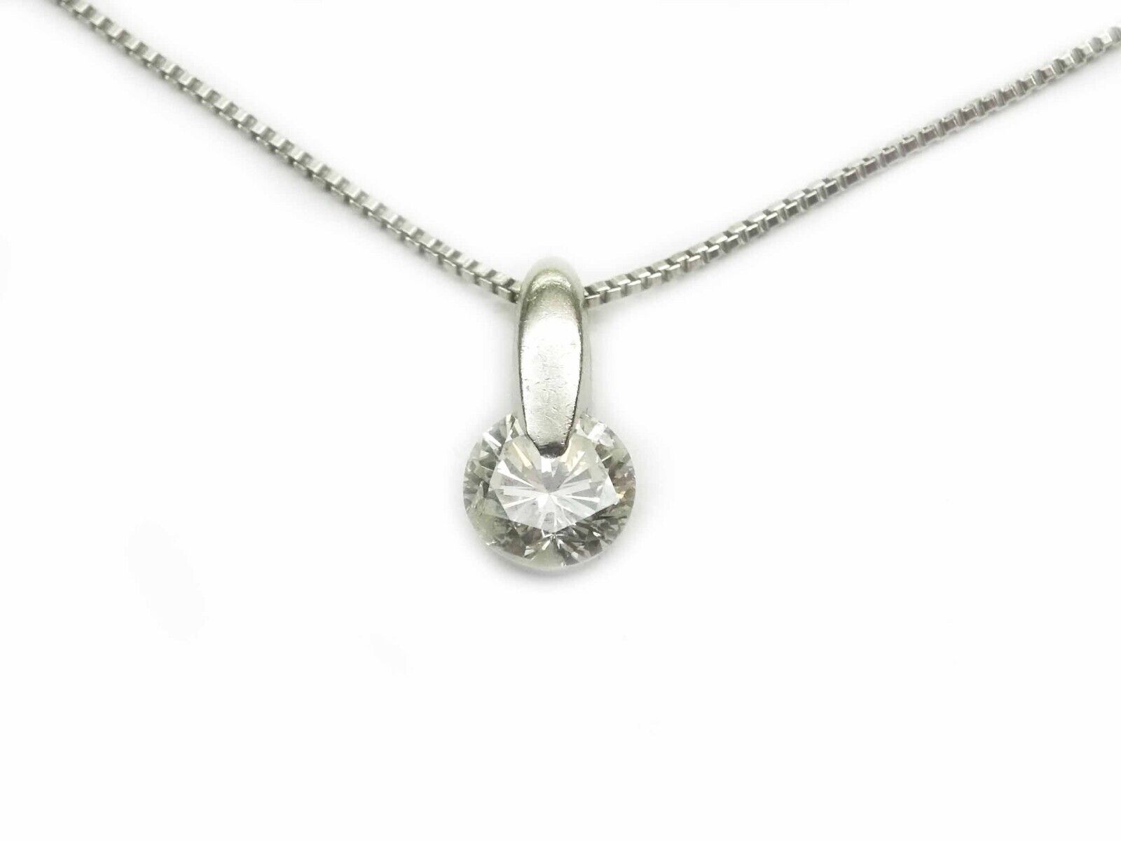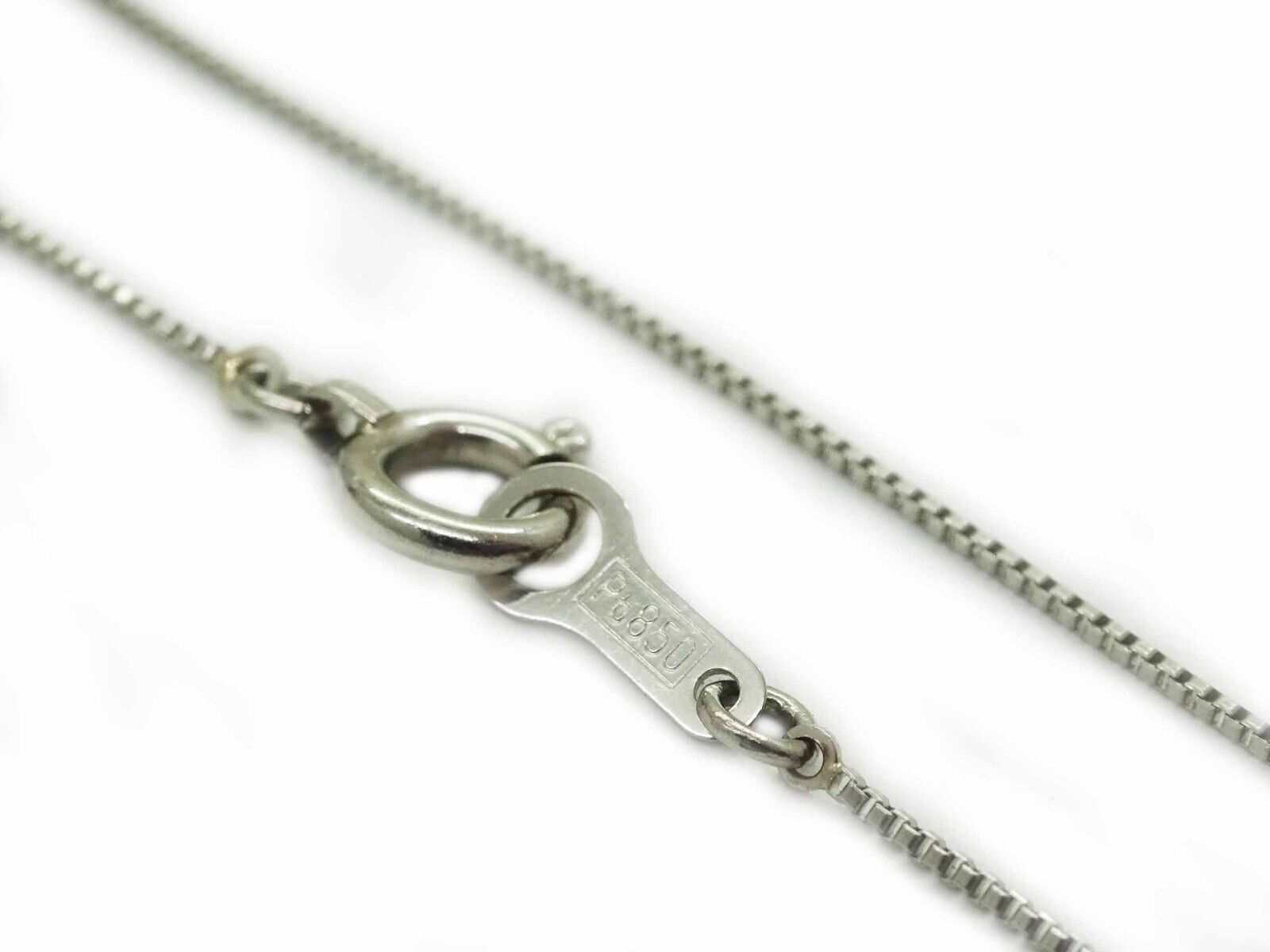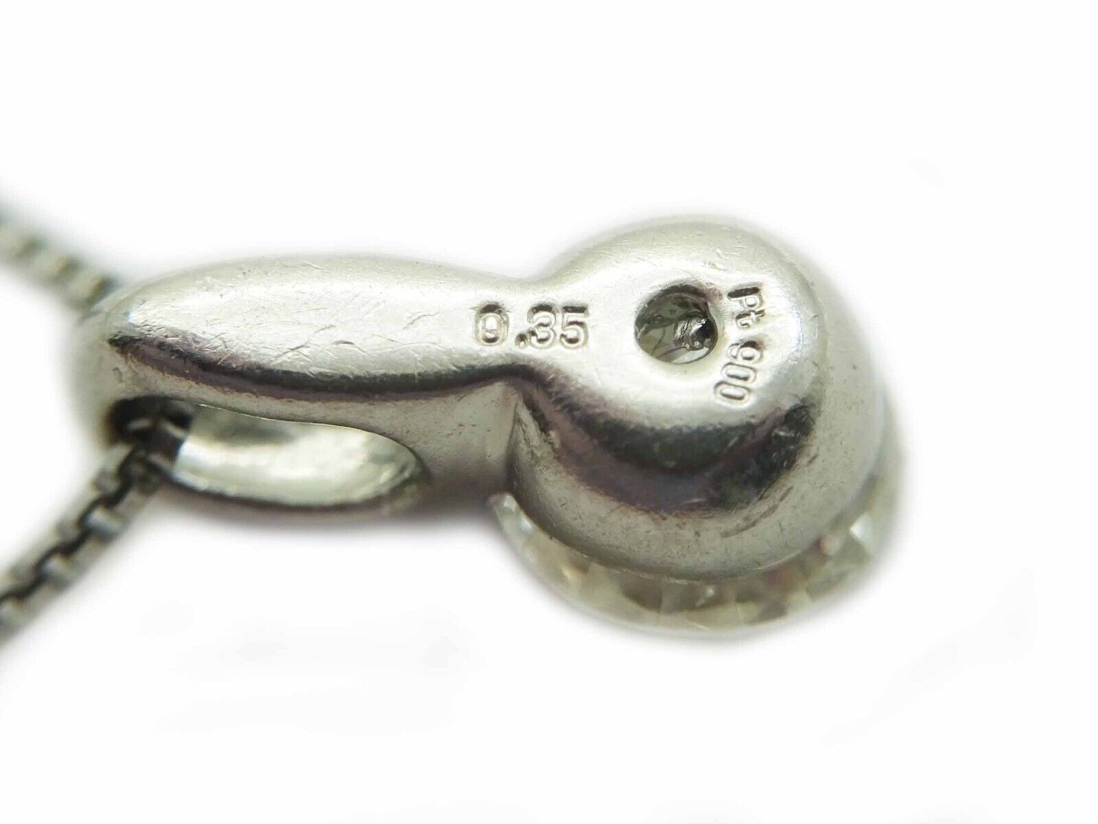 Pendant is on thin platinum box chain. Pendant marked 0.35 Pt 900. Chain marked Pt 850.
