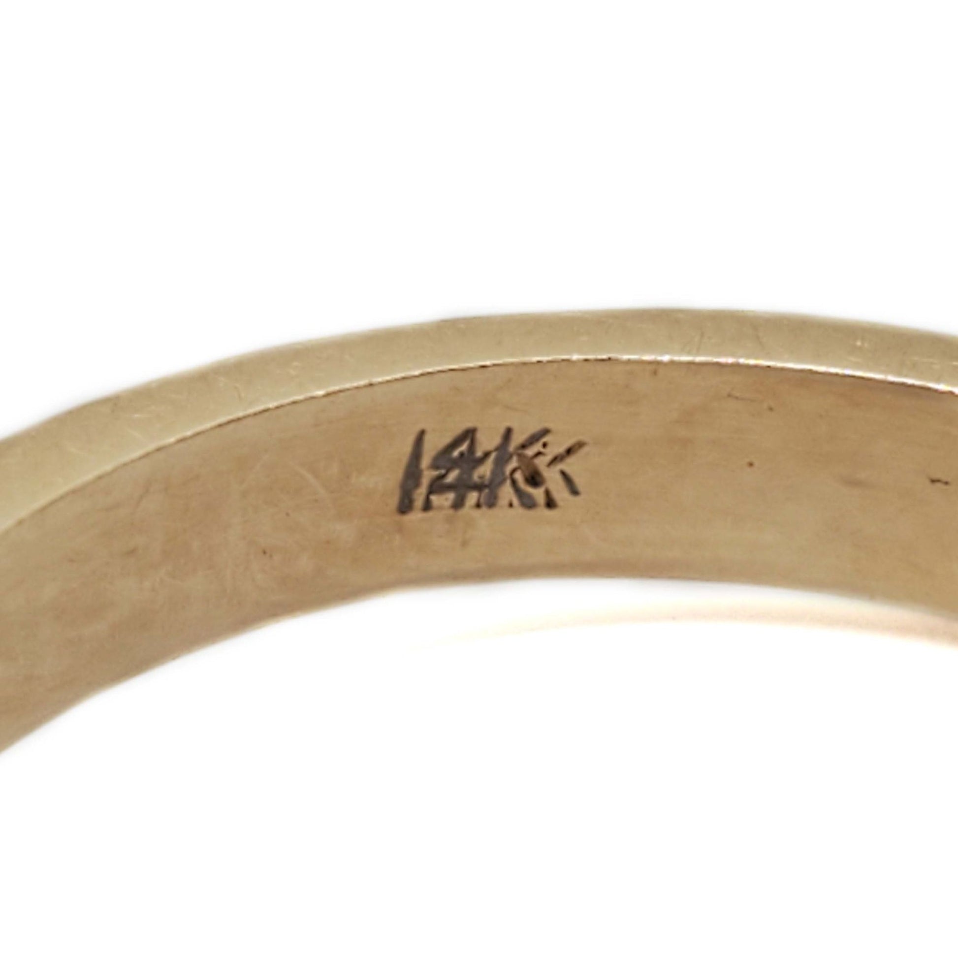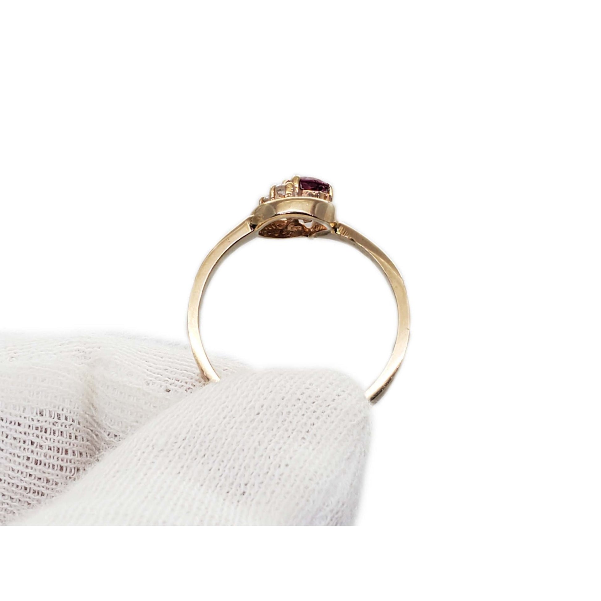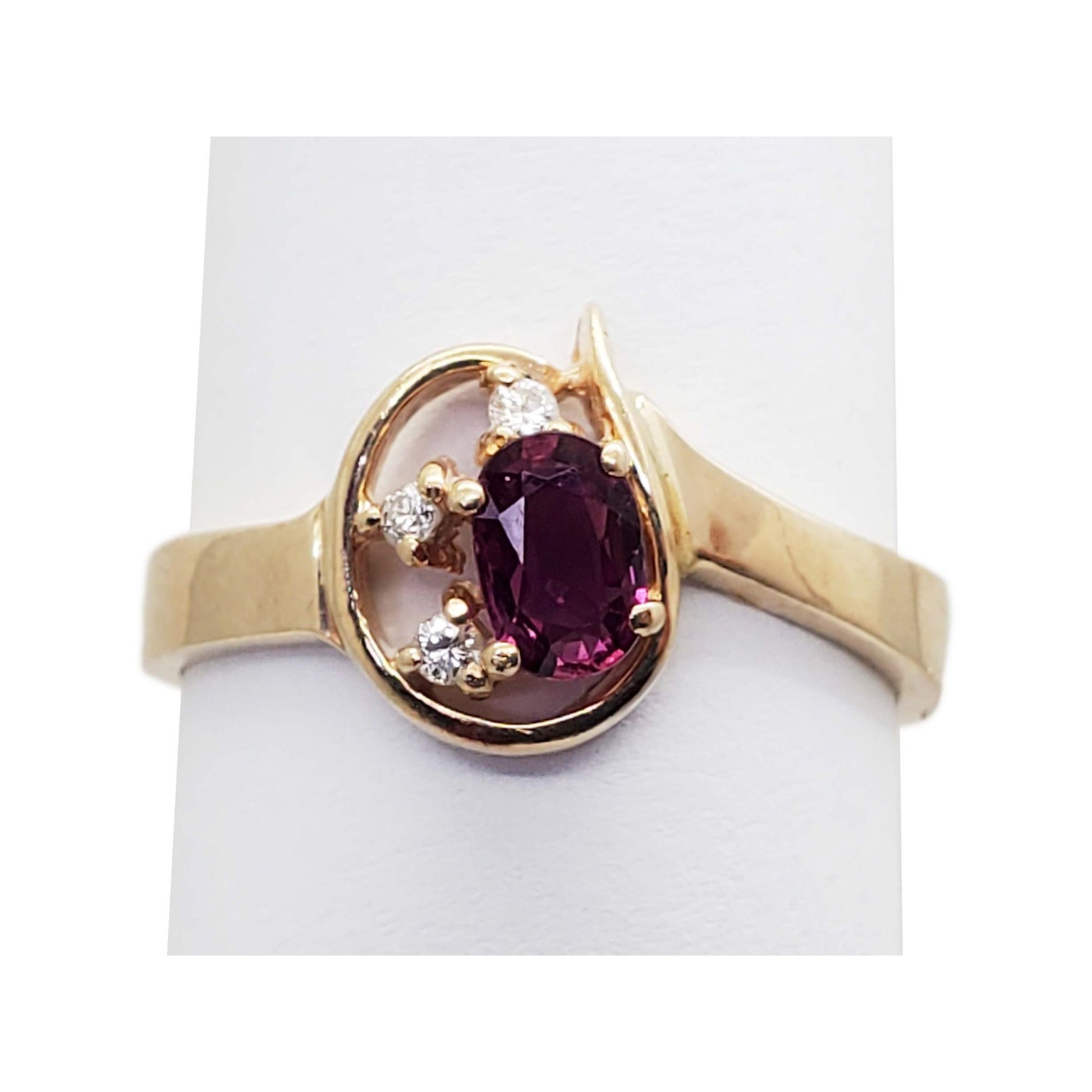 Ruby and diamond accent filigree band ring in 14k yellow gold.