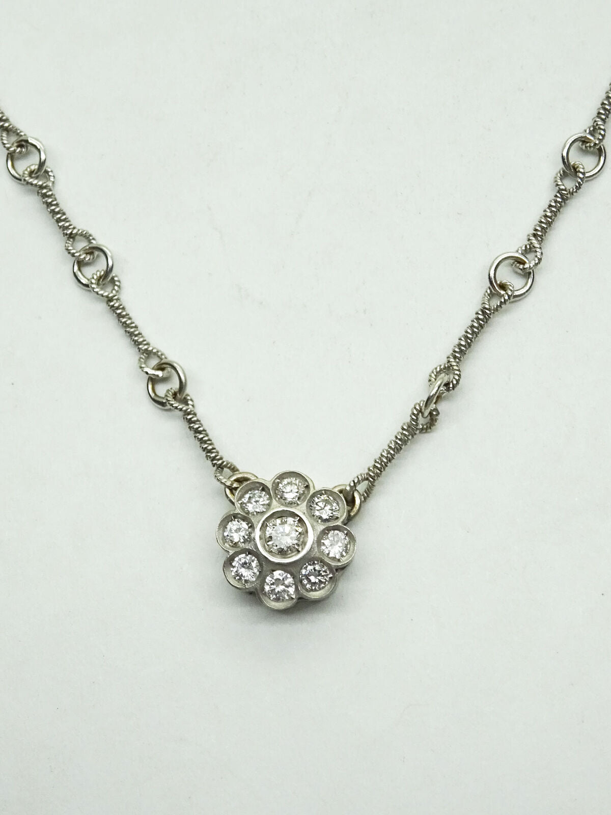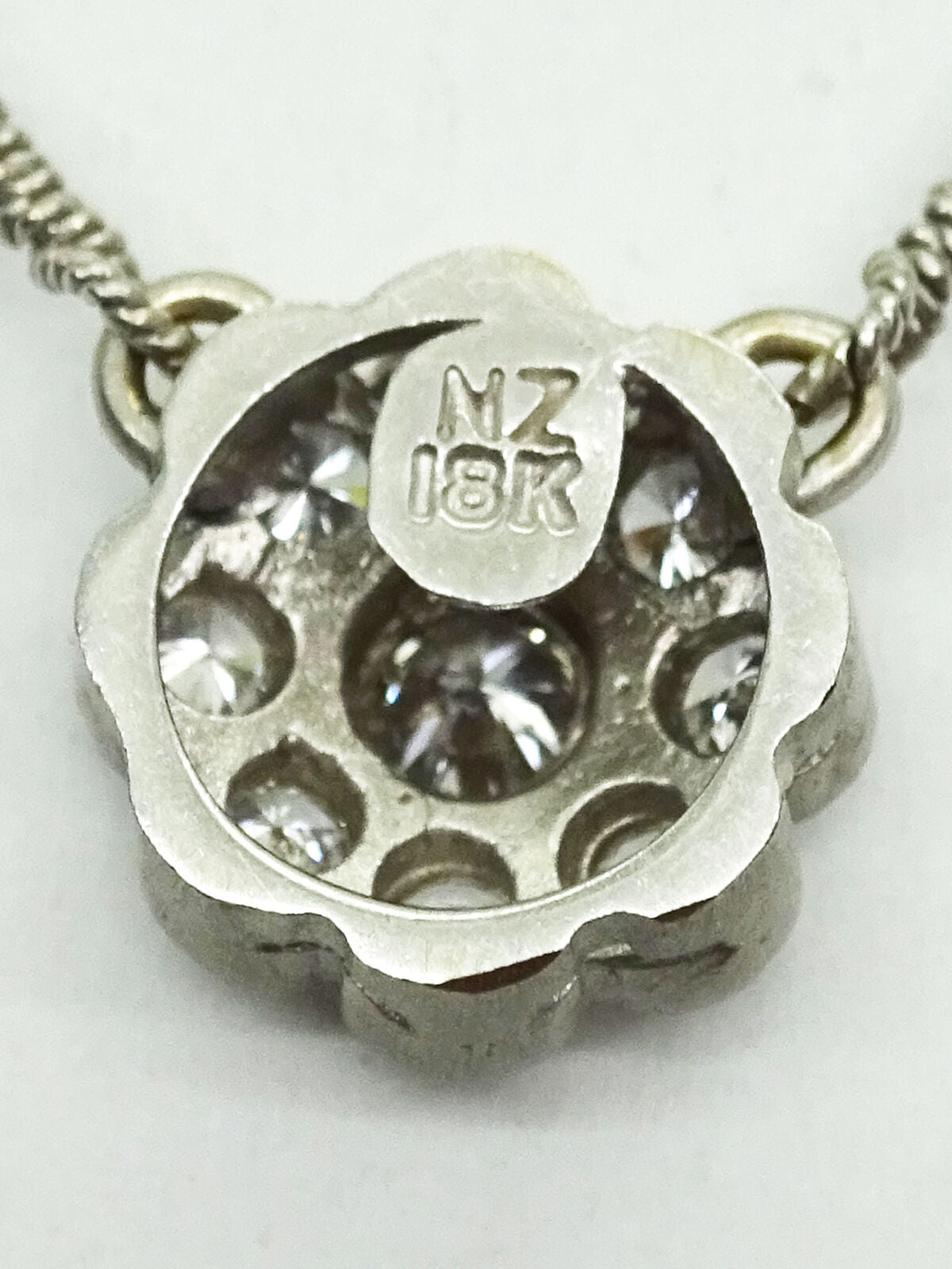 Flower halo pendant in 18k white gold, set with center round diamond estimated at 0.10ct, and haloed by 8 round diamonds estimated at 0.05ct each.