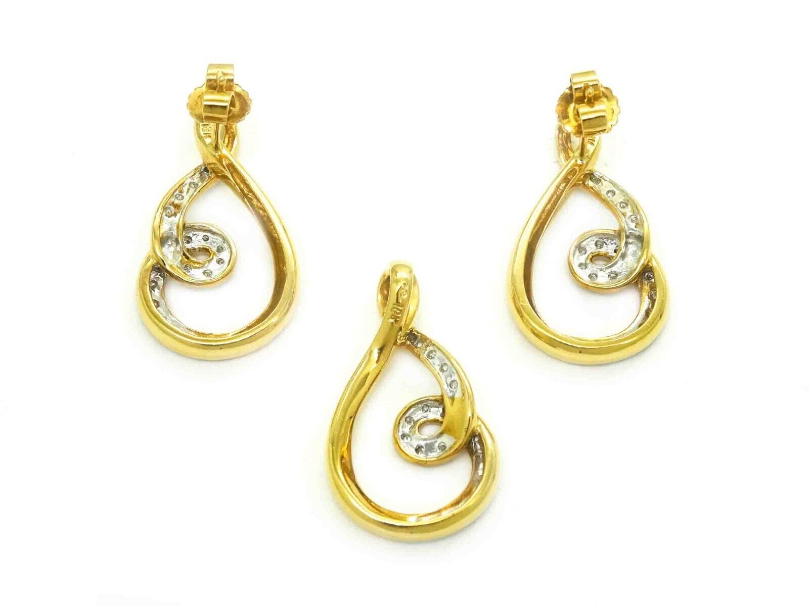 Lovely 14k gold diamond jewelry set with a pendant and pair of earrings in a swirling openwork ribbon design.