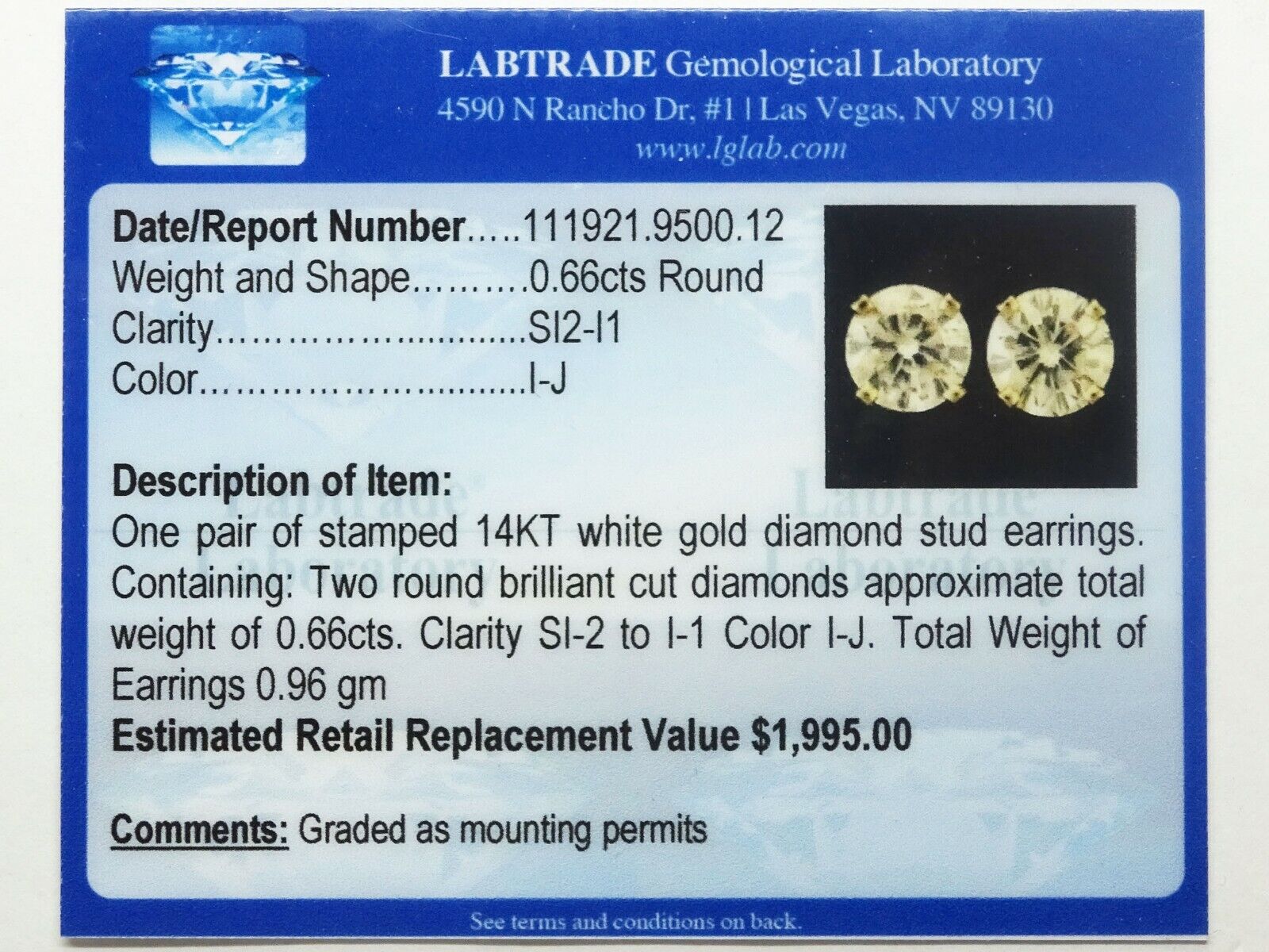 Includes Labtrade appraisal card, with replacement value of $1,995.