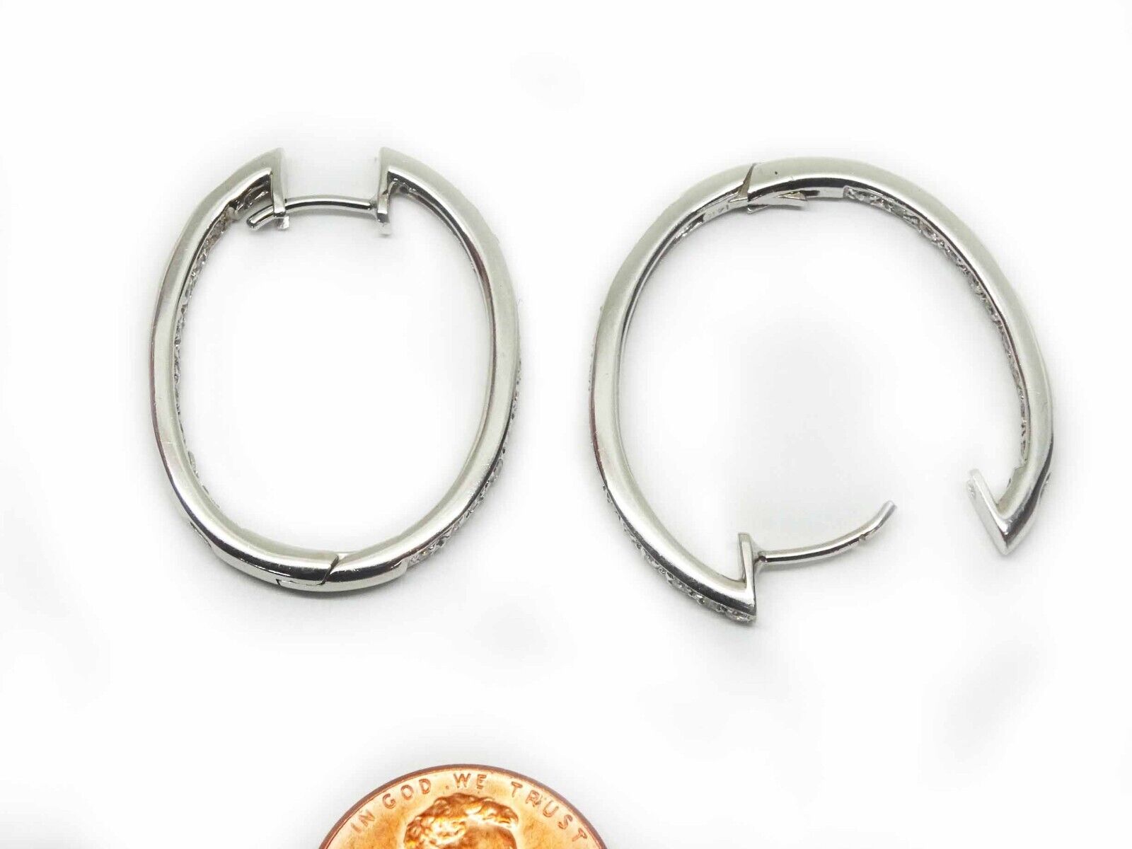 A timeless design, fine diamond oval hoop earrings in 14k white gold.