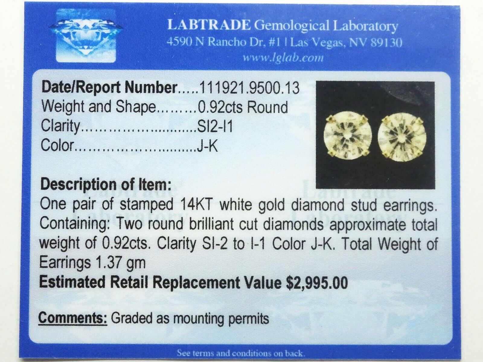 0.92ct tw Round Diamond Stud Earrings 14k White Gold