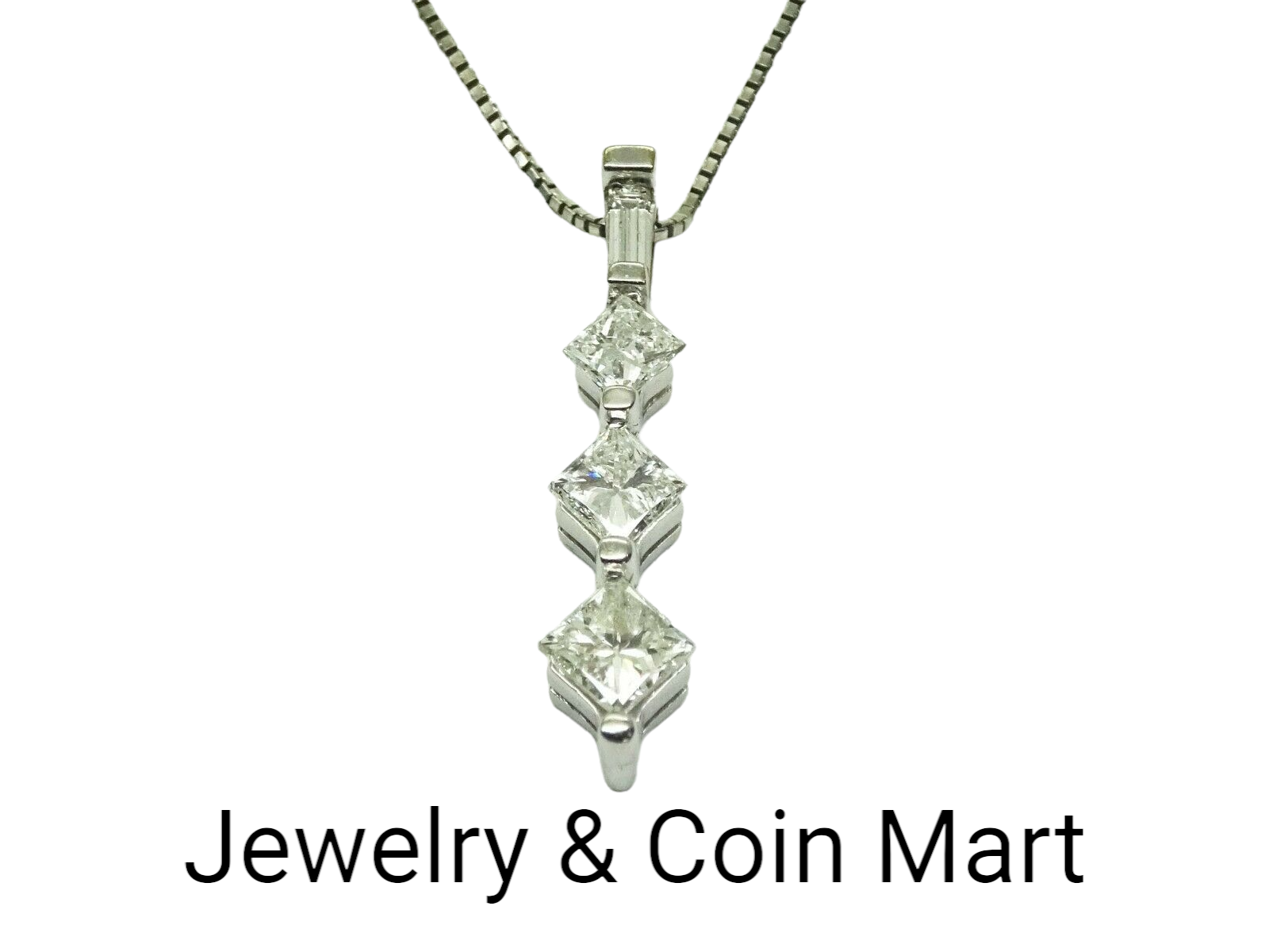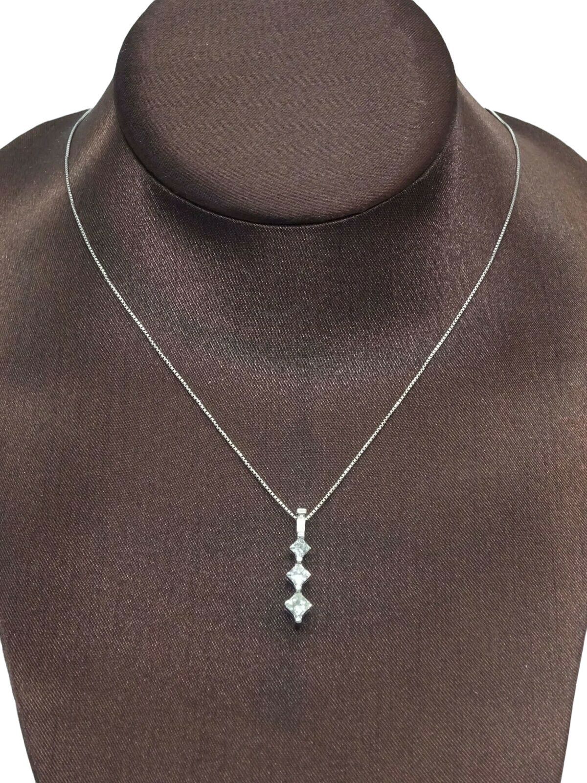 Stunning 3-gem princess diamond drop pendant in 14k white gold, on 14k white gold box chain.