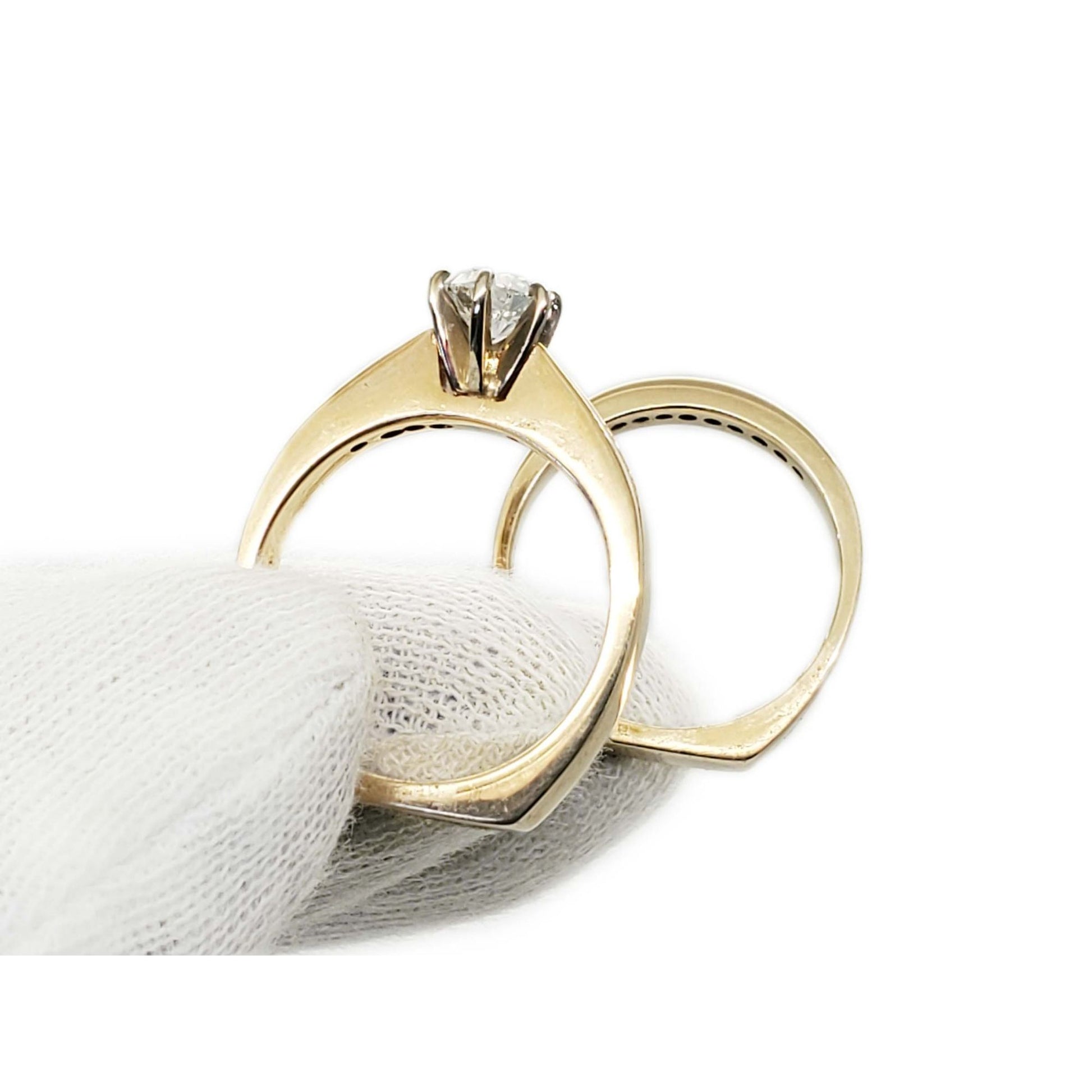 Ladies diamond engagement set, consisting of an engagement ring and a wedding band, both in 14k yellow gold and with flat Euro shanks.