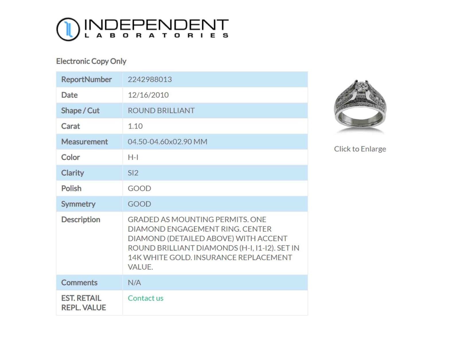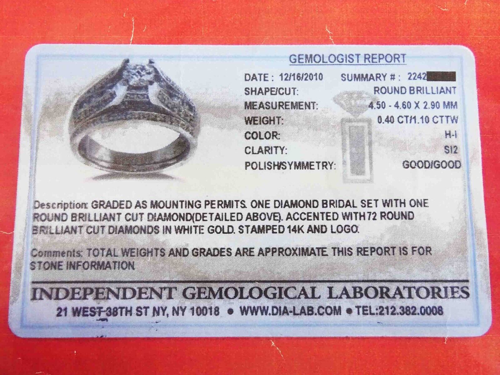 Graded by Independent Gemological Laboratories, Gemologist Report #2242988013 (marked on inside of band), dated 12/16/2010.