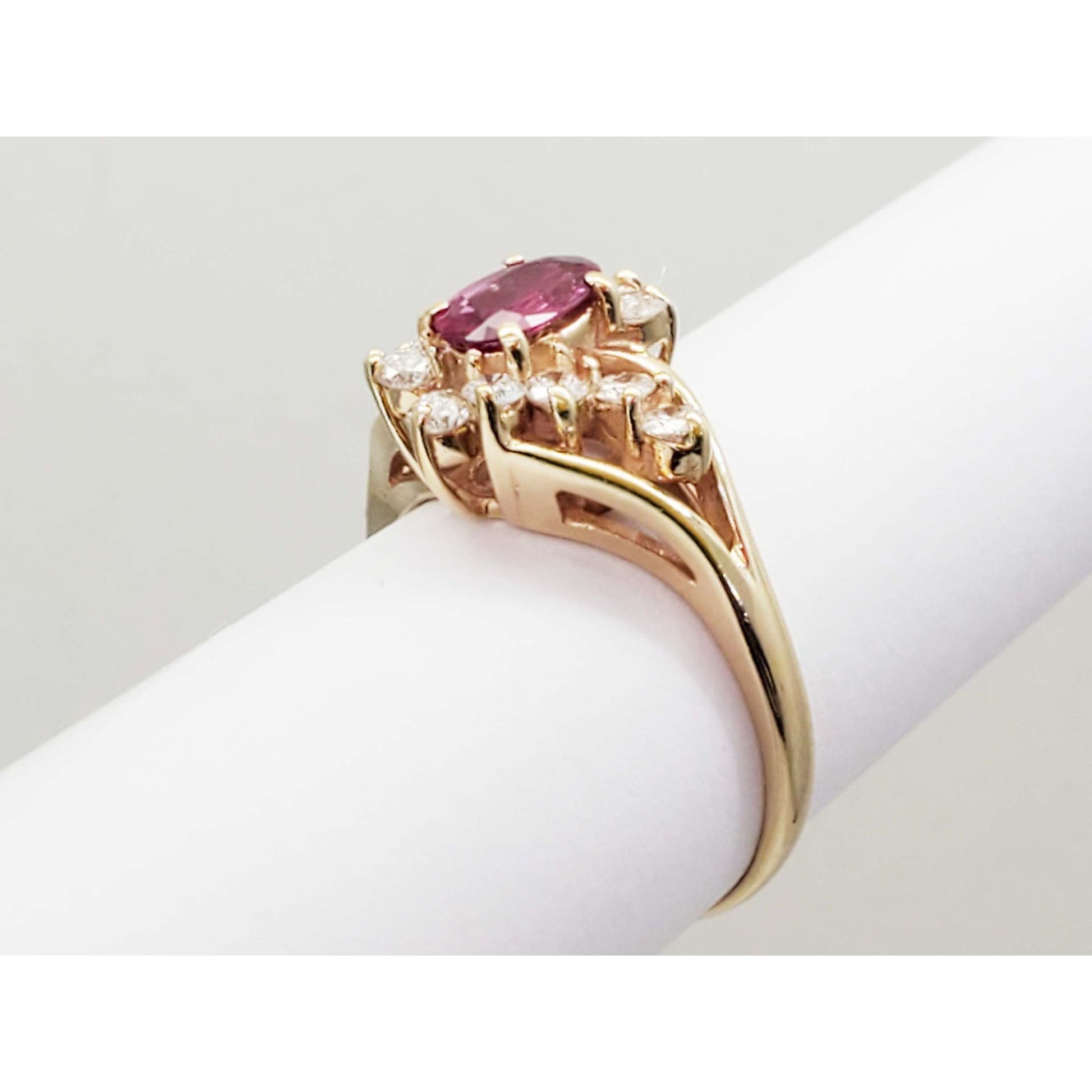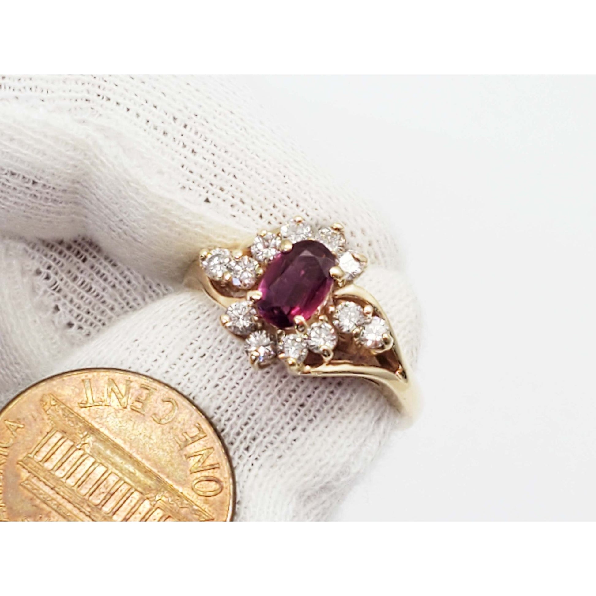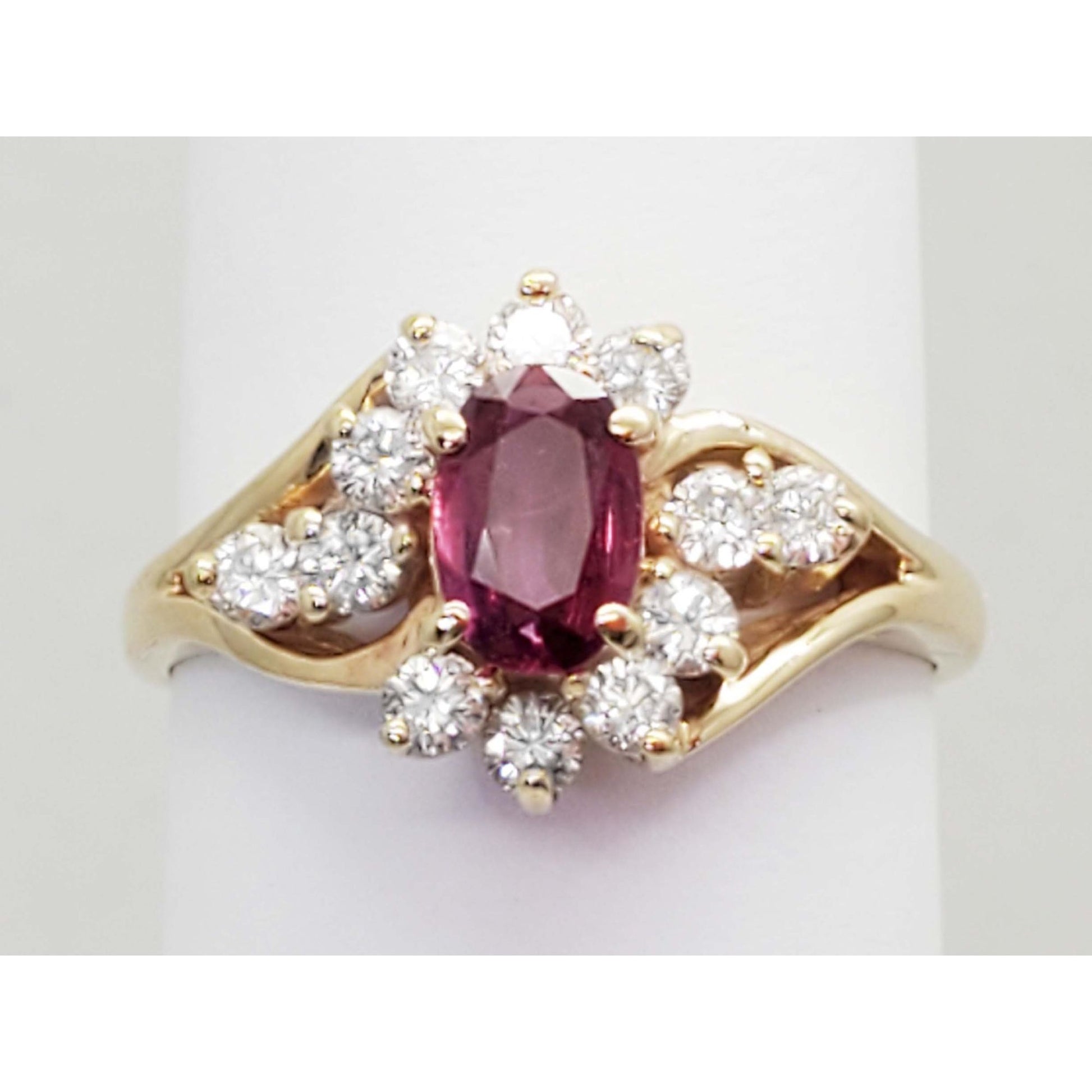 Center is set with an oval natural ruby, approximate dimensions 7.06mm x 4.68mm x 2.12mm, estimated at 0.59 ctw gem weight.