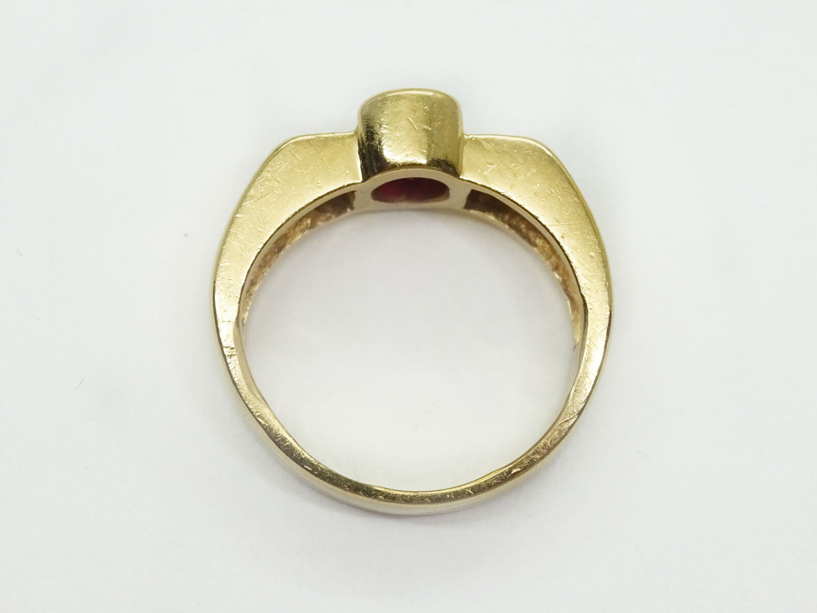 Heat treated ruby with diamond accents set in 14k yellow gold ring.