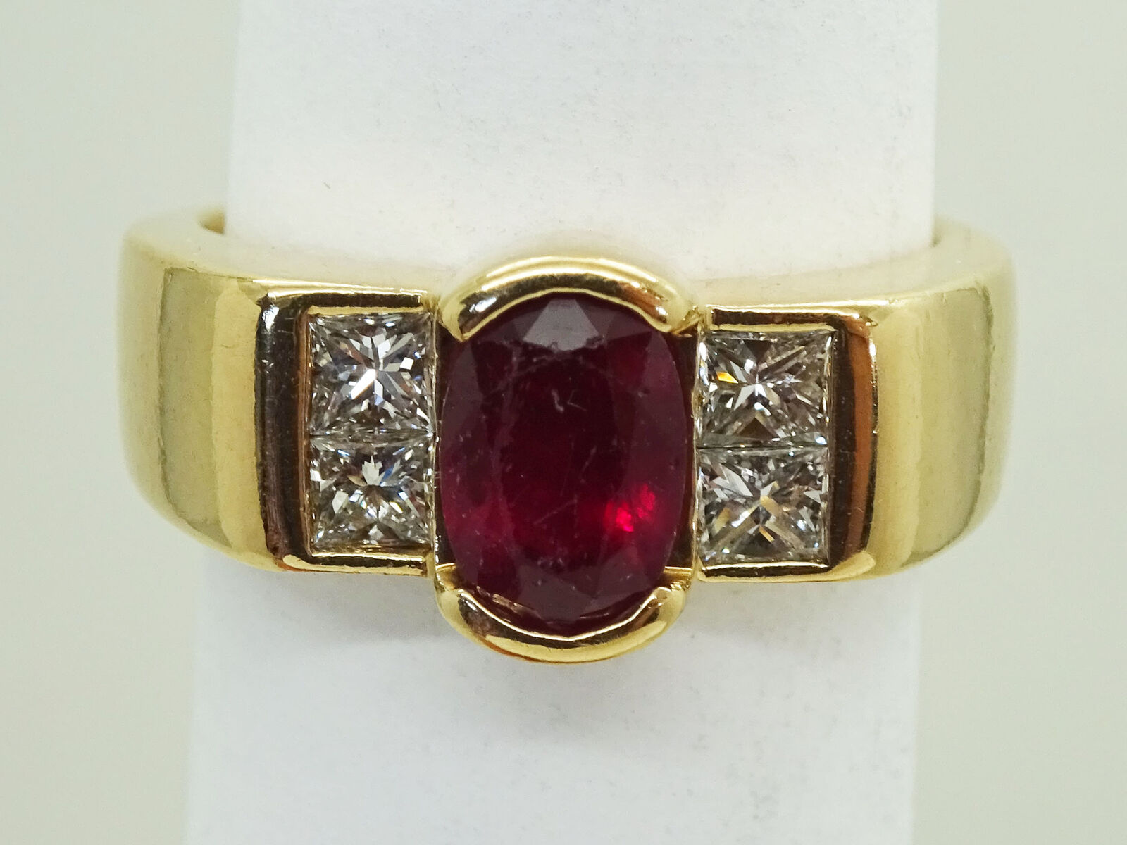 Set with center oval natural ruby, heat treated, 7.3mm x 5.3mm x 3.8mm, estimated at 1.3ct gem weight.
