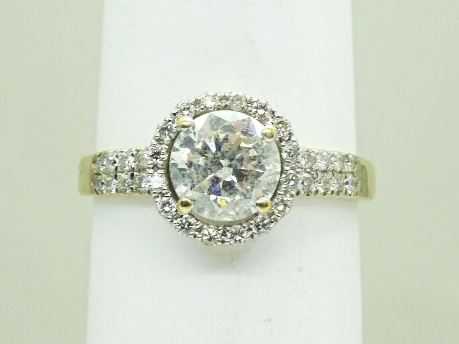 Center set with round brilliant natural earth mined diamond estimated at 1.25ct gem weight. Diamond clarity is I2, and color is K.