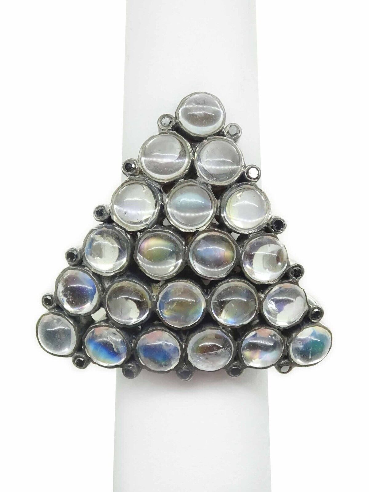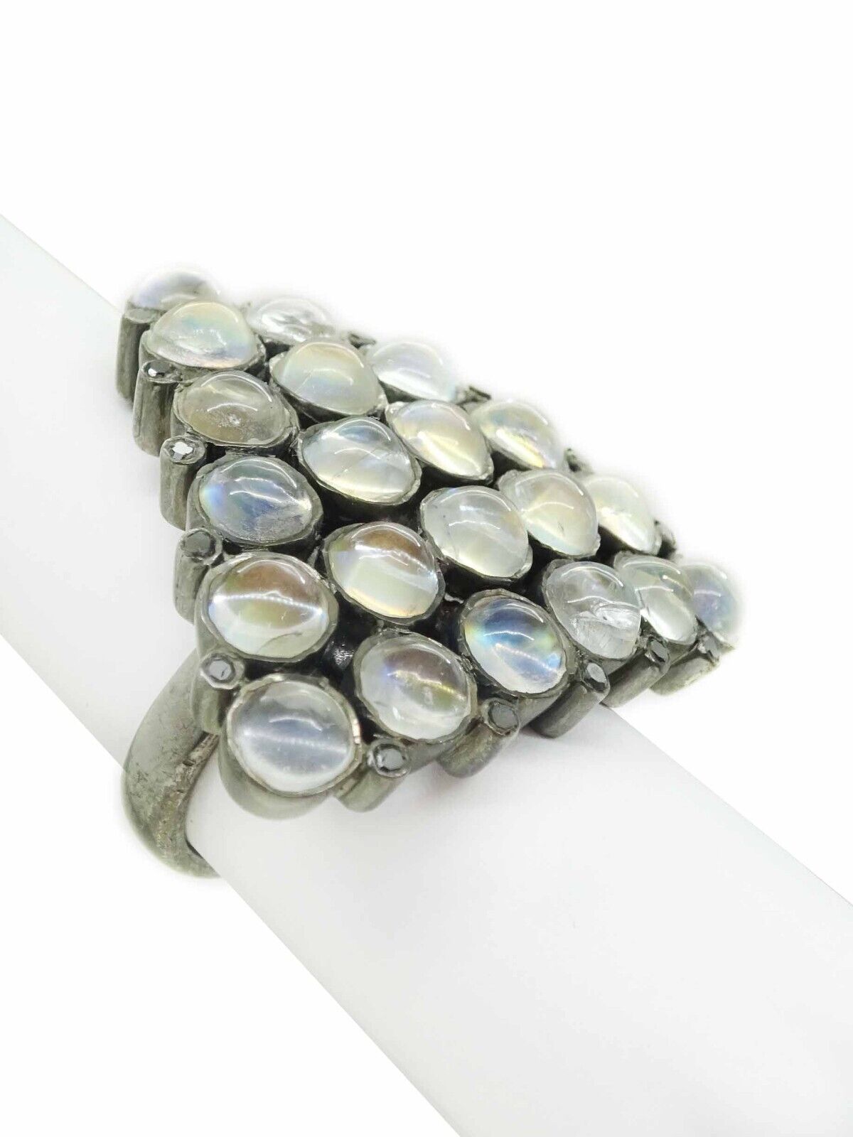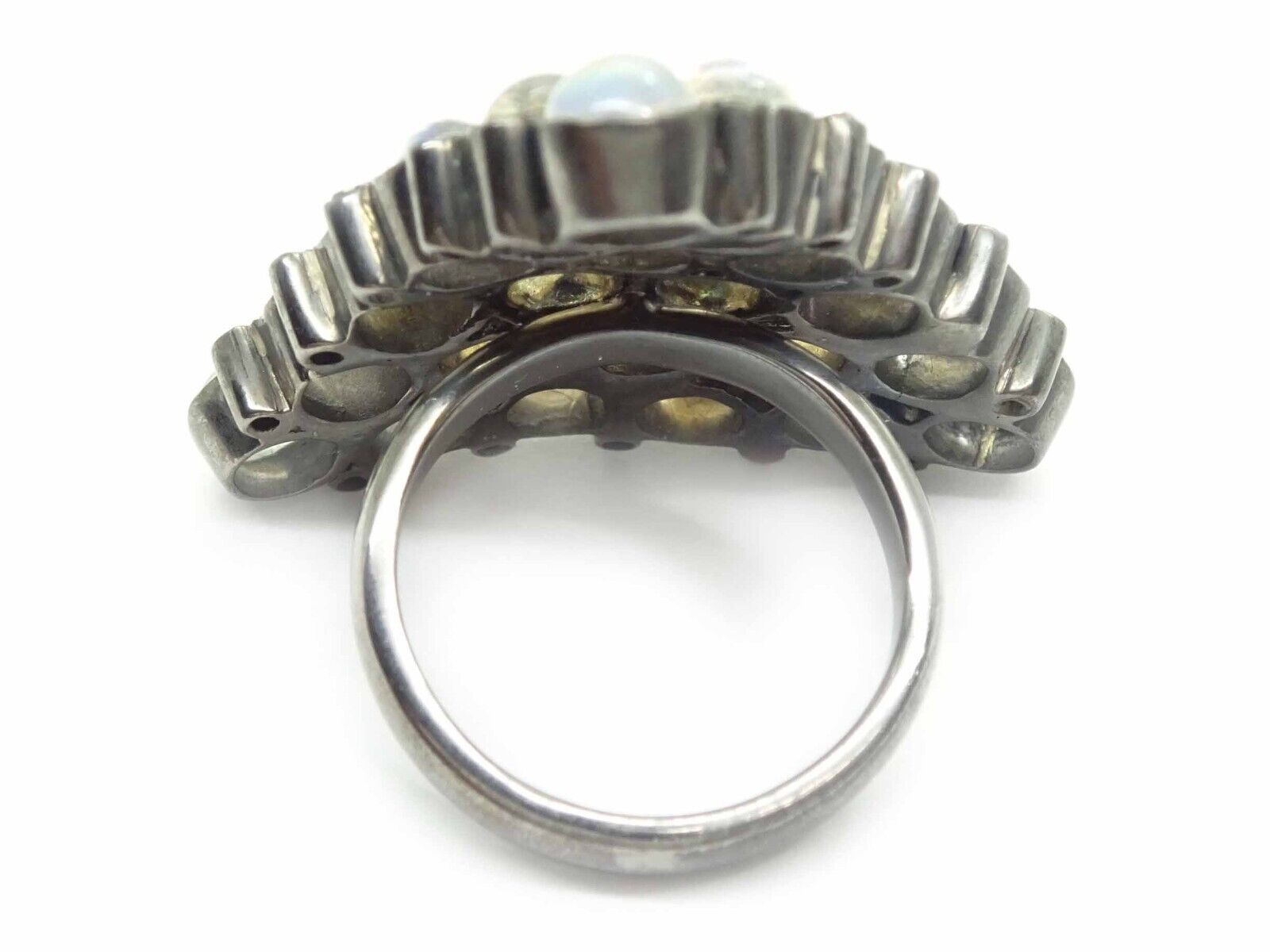 Rhodium-plated sterling silver cocktail ring, featuring moonstones & black diamonds.