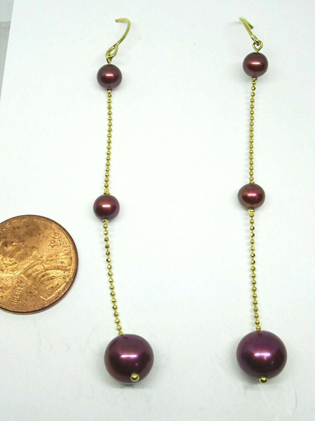 Red Dyed Pearl Dangle Earrings 10K Gold 3" Long