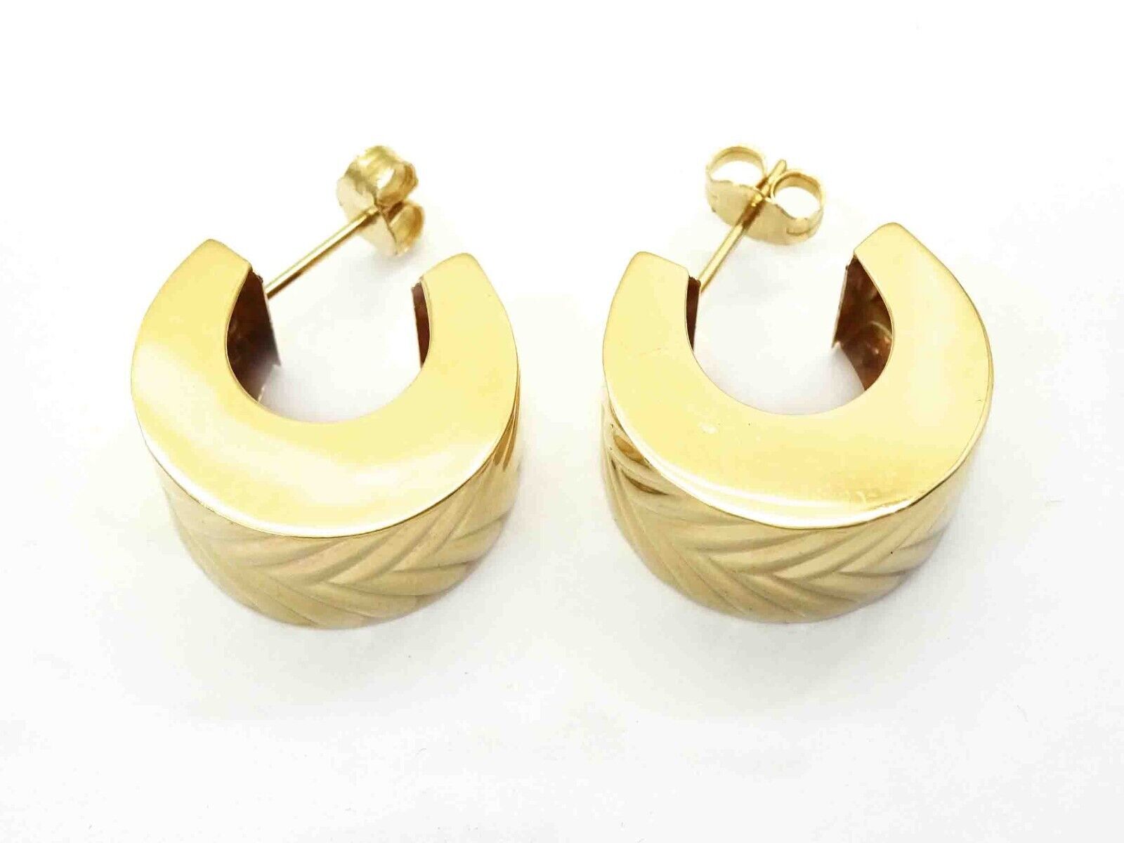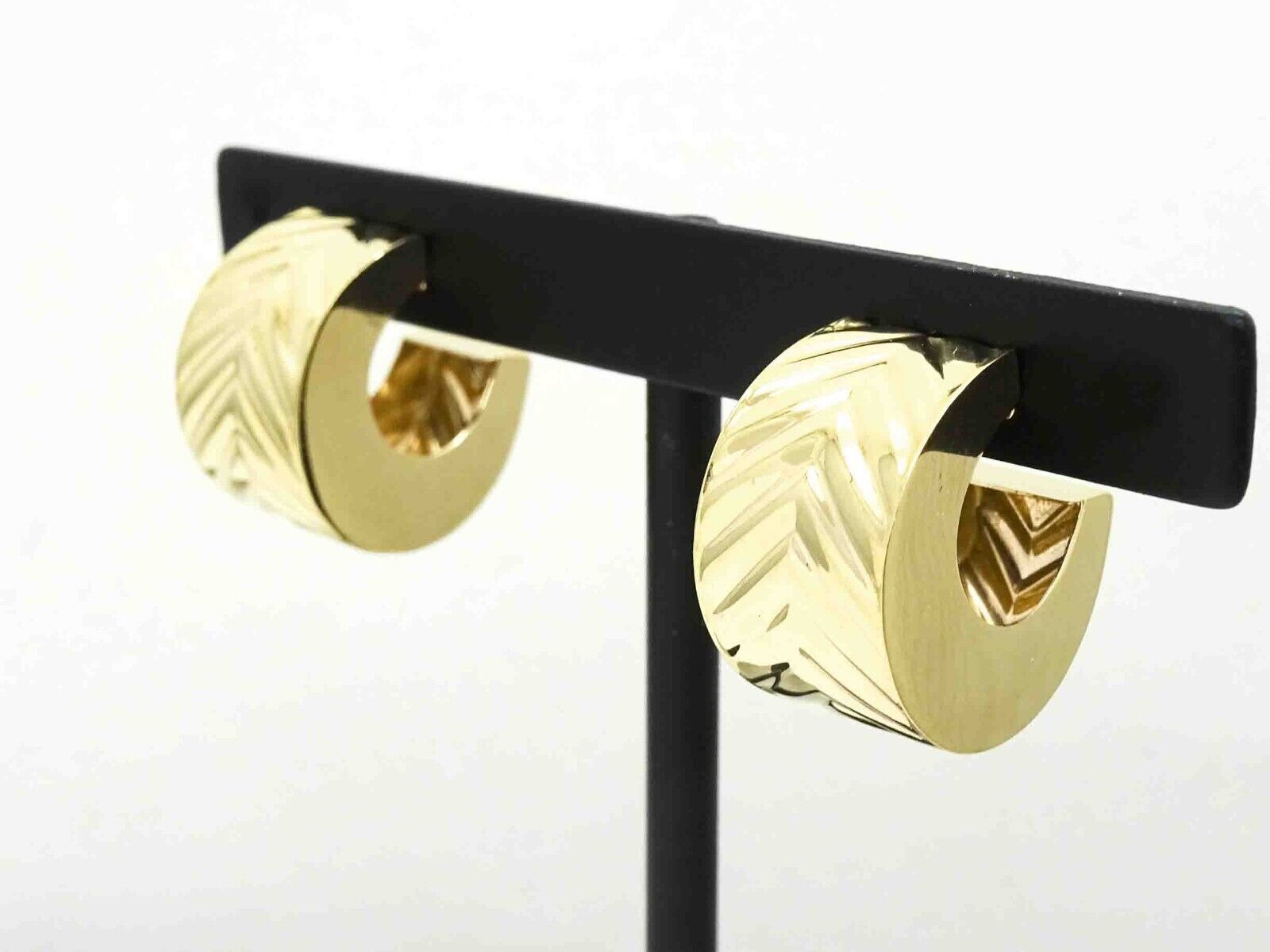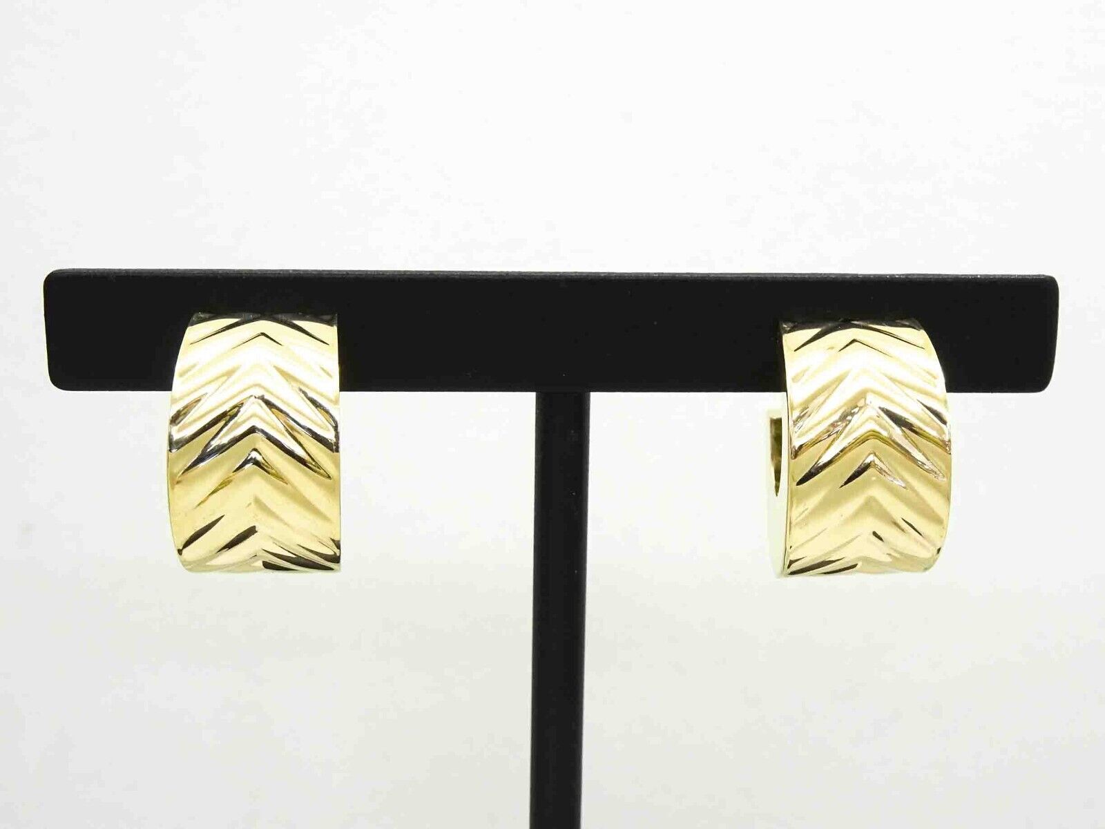 Pair of wide herringbone-design huggie hoop earrings in 14k yellow gold.