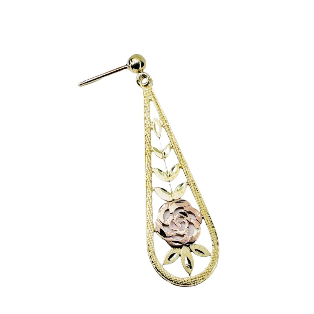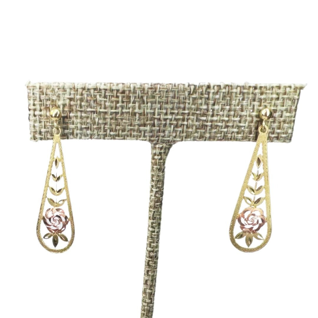 14k Multi-tone Gold Fine Etched Rose Dangle Earrings