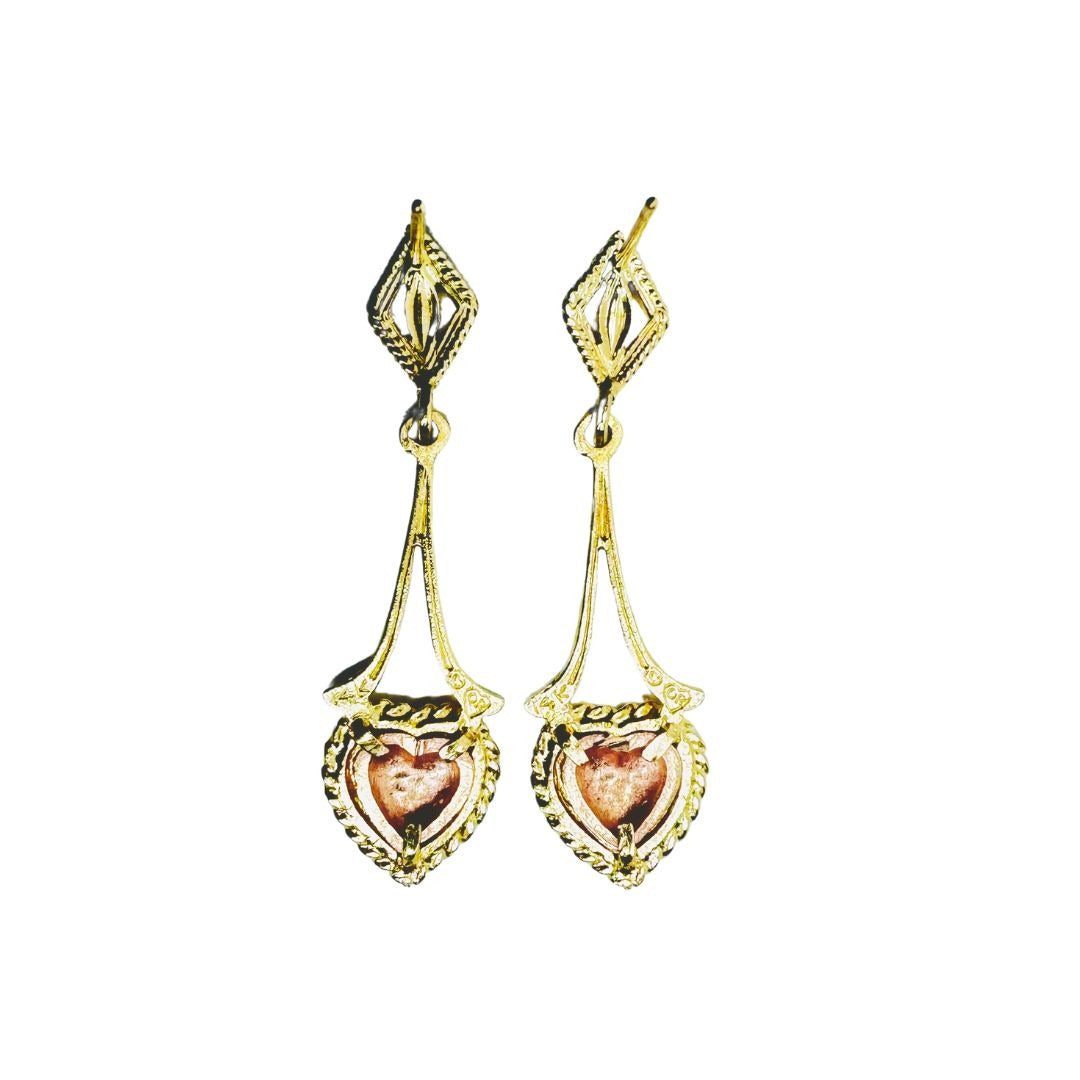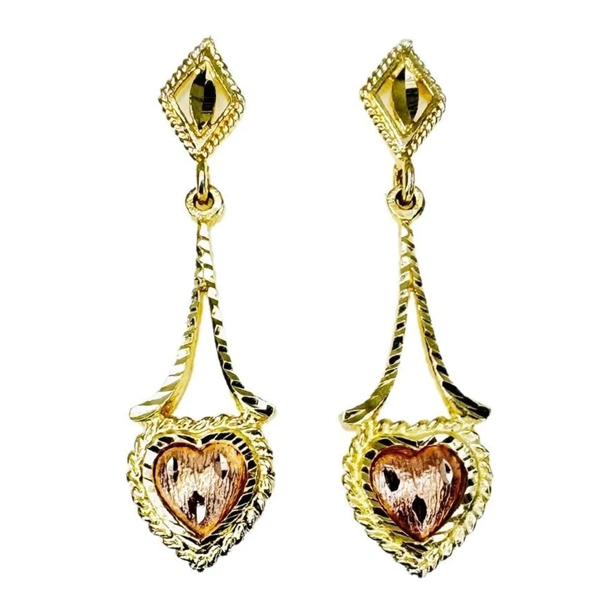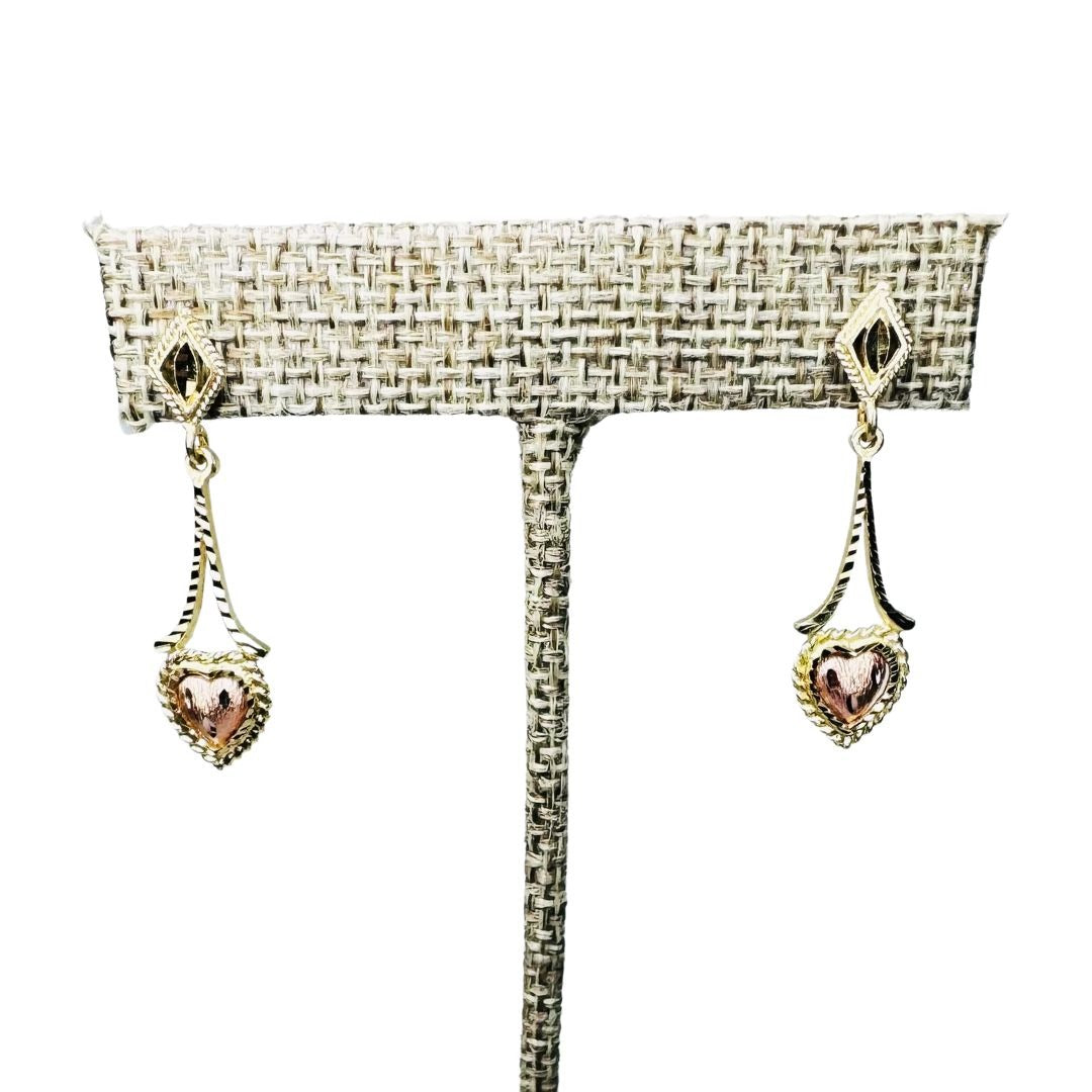 14k Two Tone Gold Etched Hanging Heart Earrings