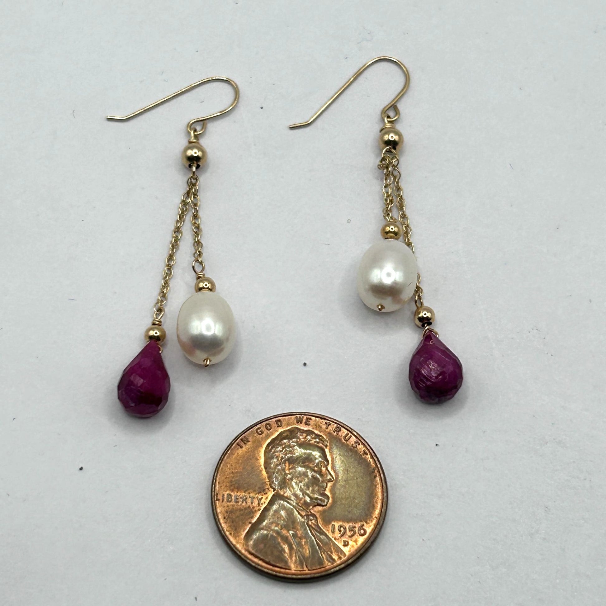 14k Yellow Gold Pearl & Created Ruby Dangle Drop Earrings