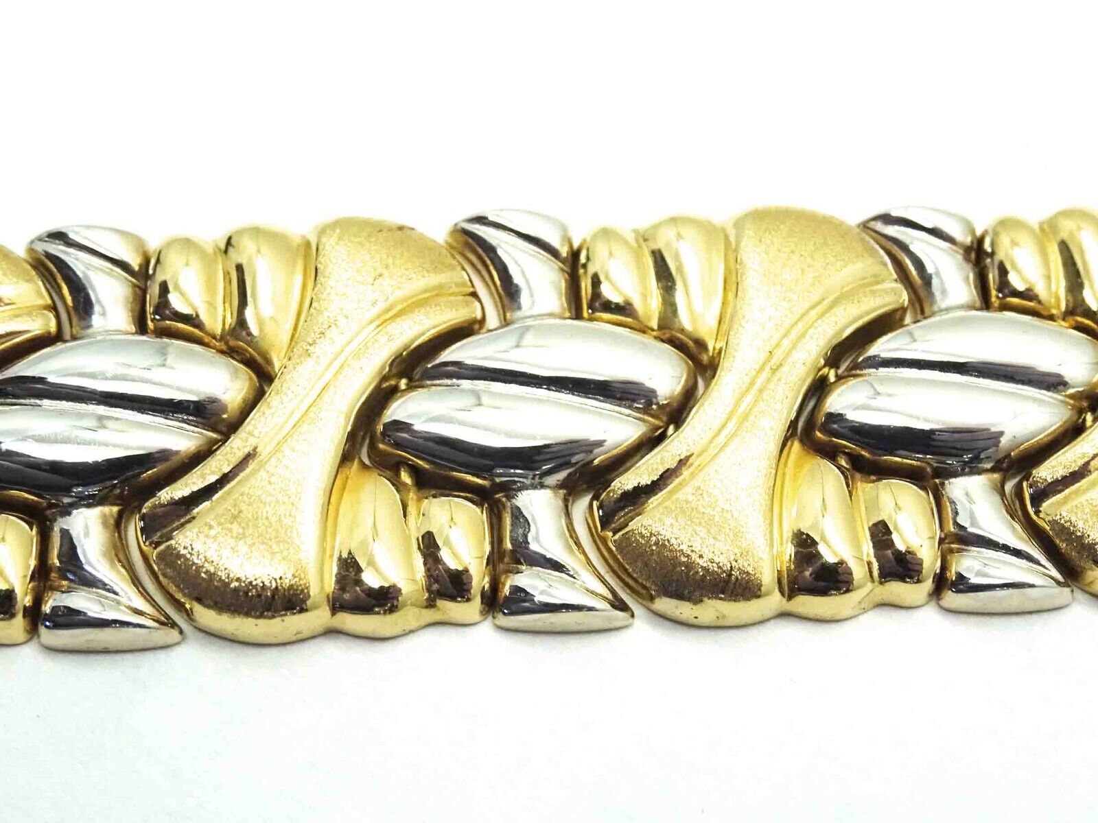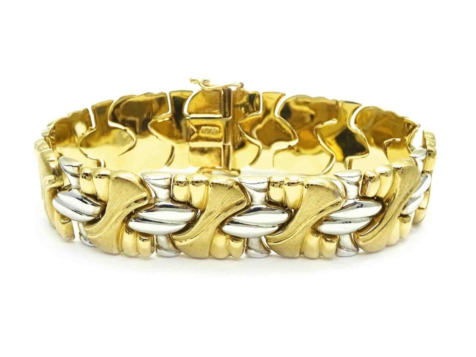 Fancy design wide two-tone panel link tennis bracelet in 14k yellow and white gold