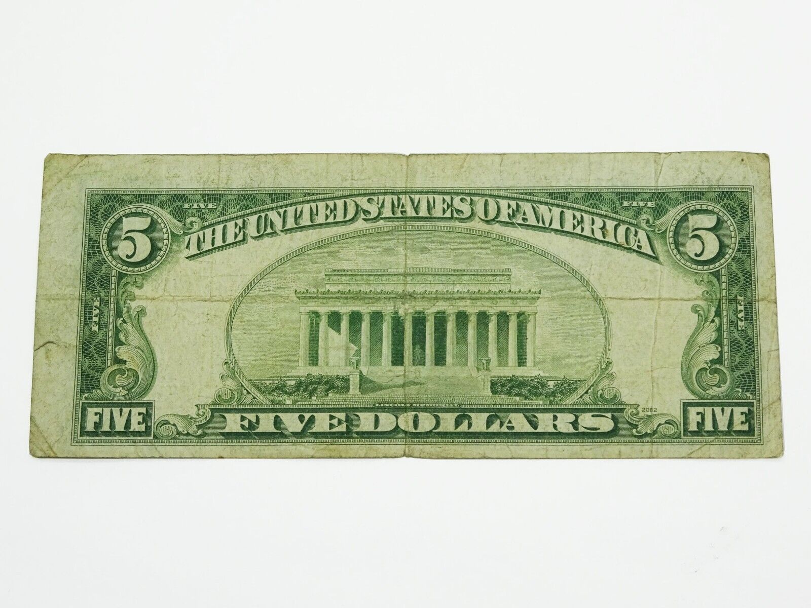 Series of 1950 $5 five dollar Federal Reserve note, with the bottom and left parts of the note cut closer to the noteâs design than intended.