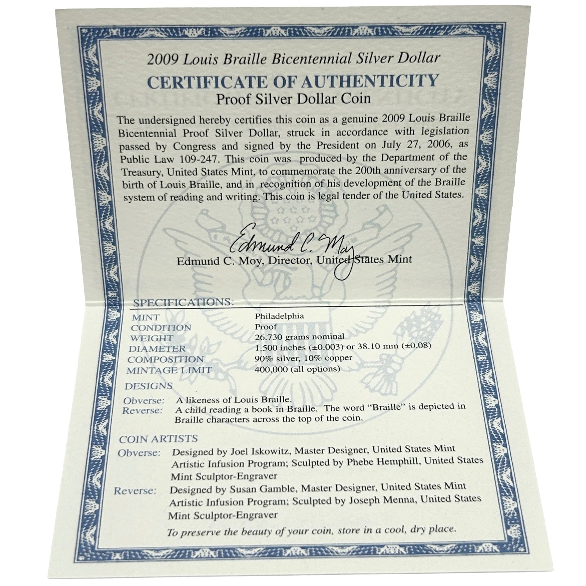 2009-P Louis Braille Bicentennial Silver Commemorative Dollar Proof $1 Coin OGP