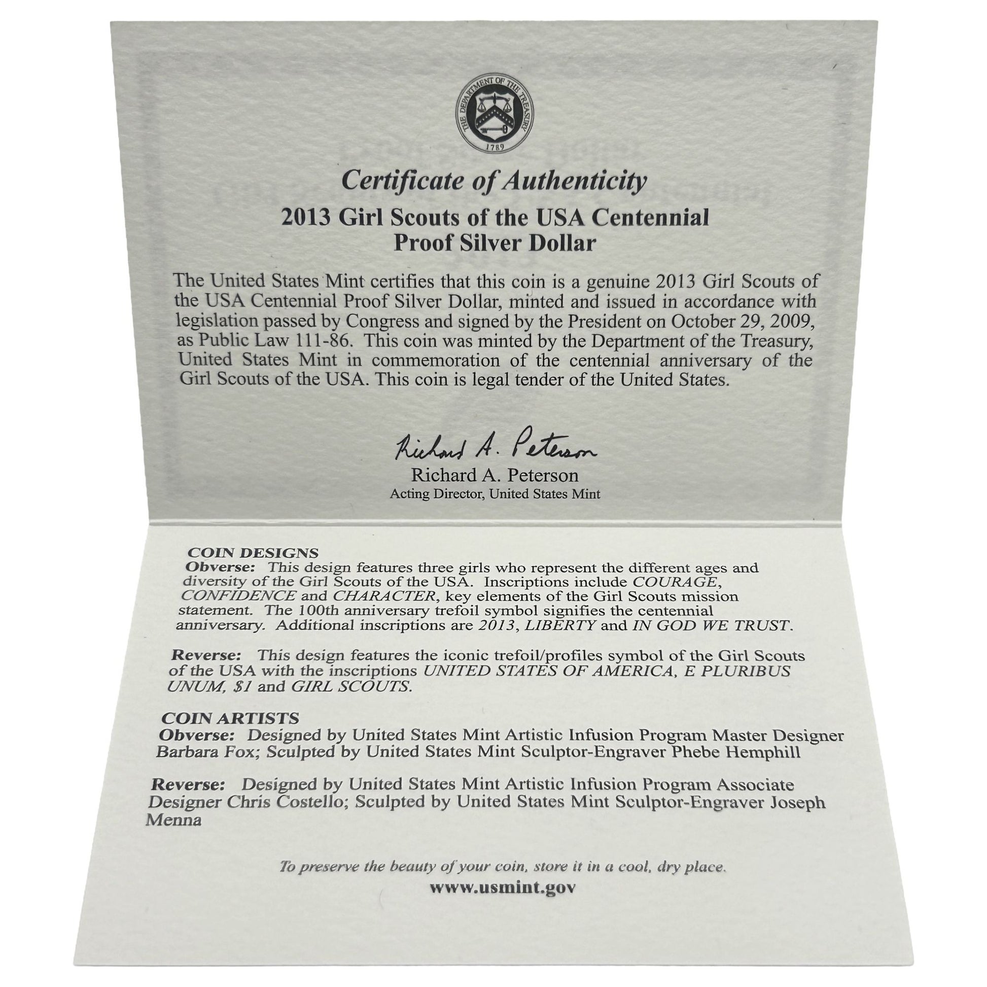 2013 W Girl Scouts Centennial PROOF Silver Dollar US Mint Coin with Box and COA