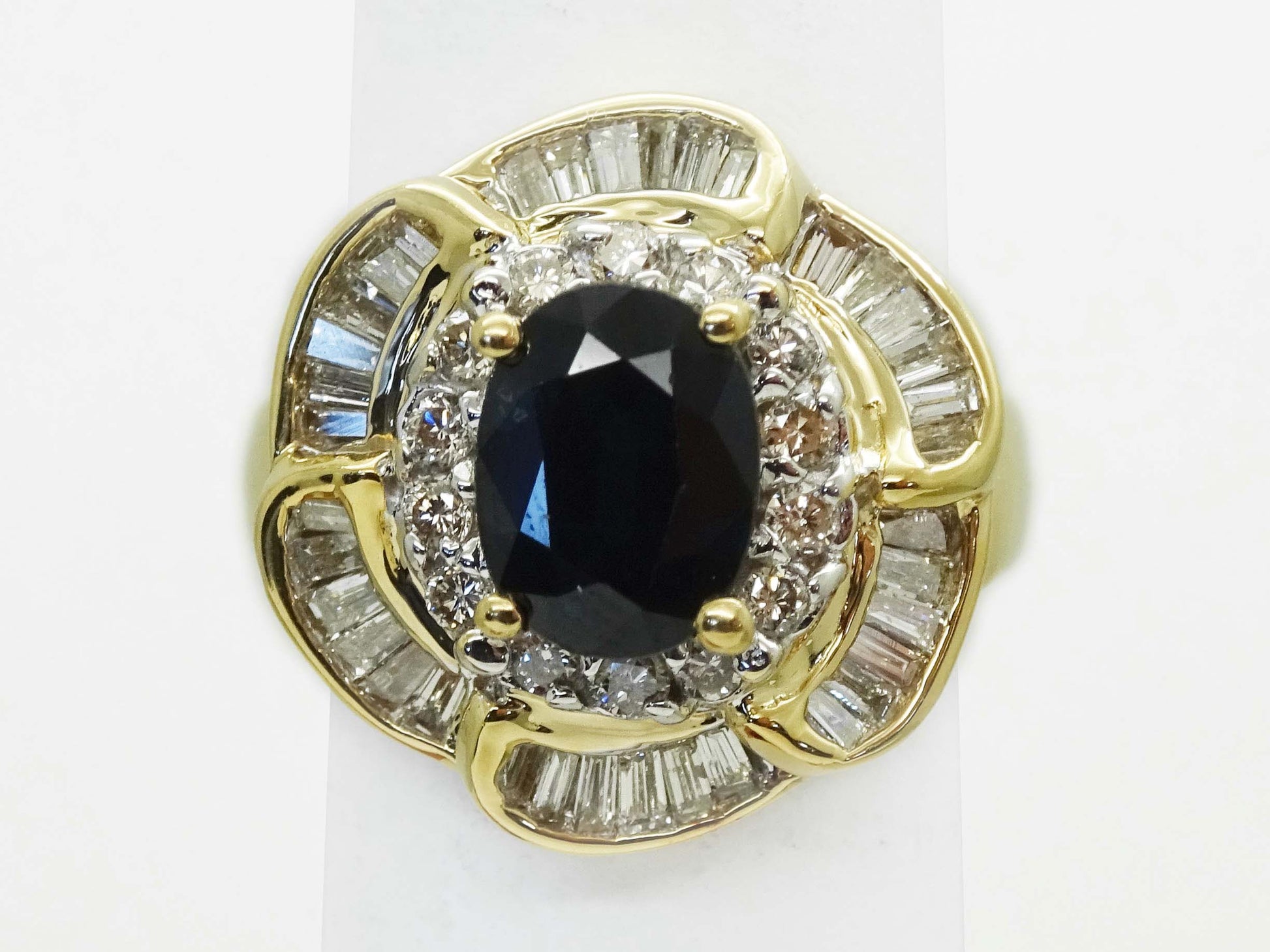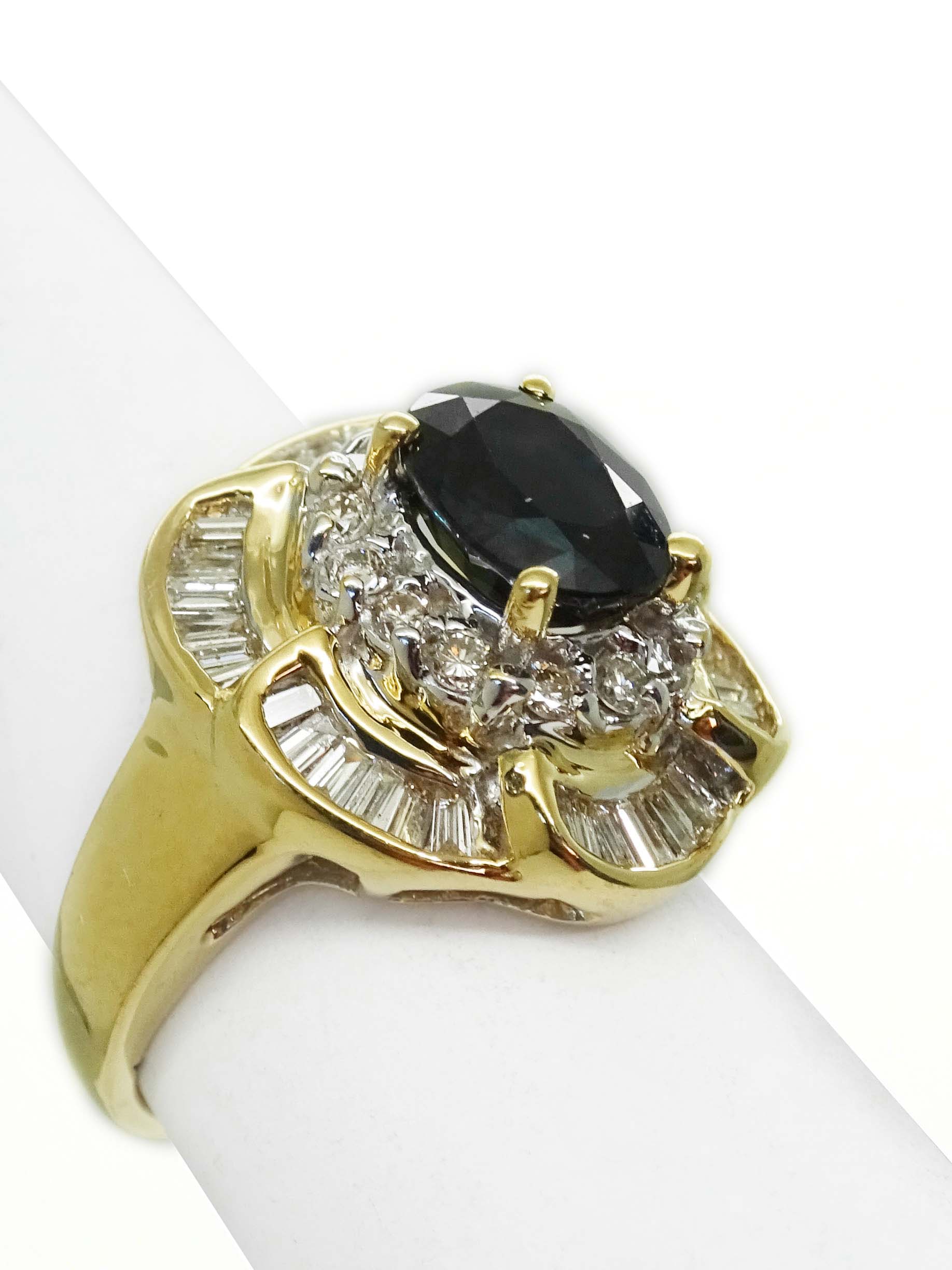 Yellow gold ring in 14k, set with natural oval blue sapphire & earth mined diamonds.