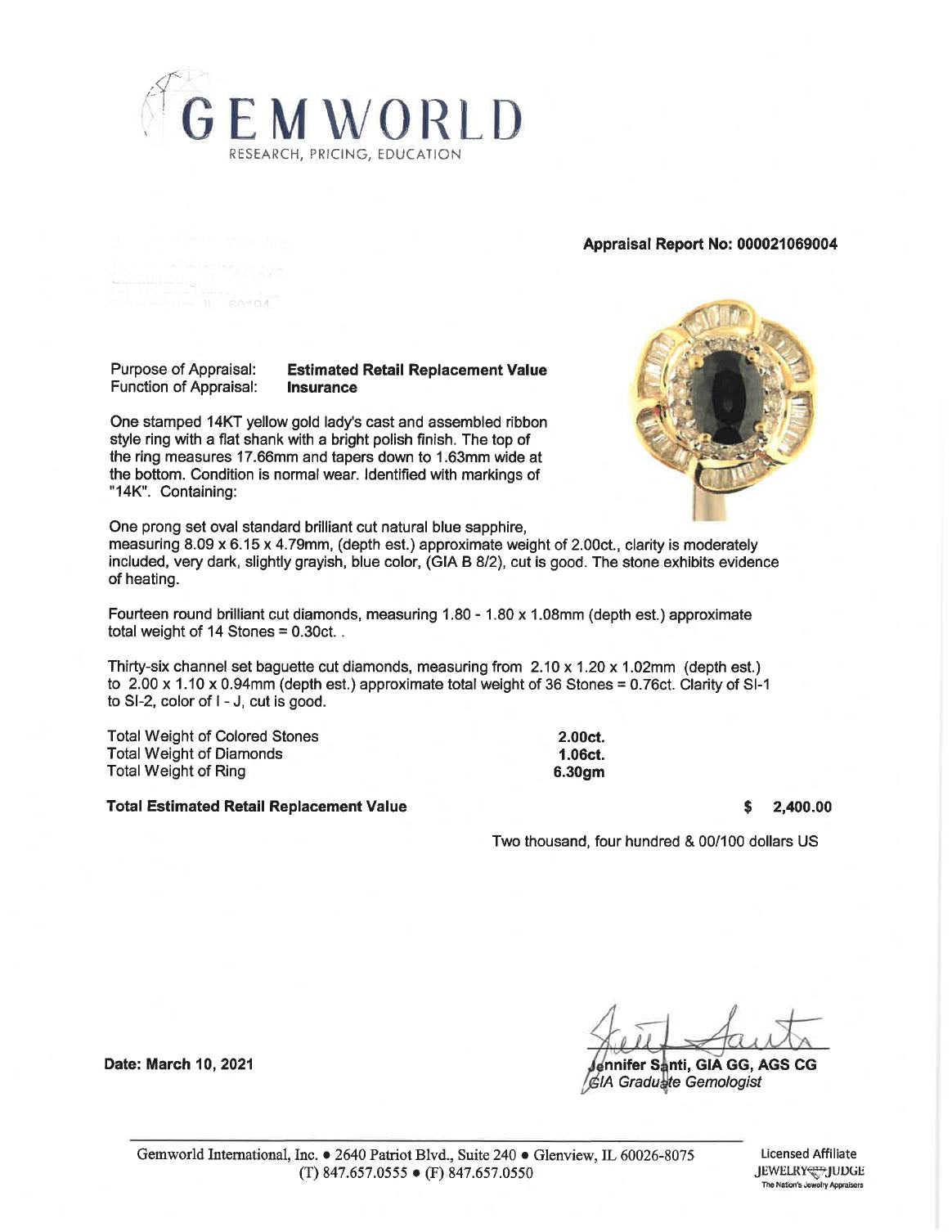 Includes Gemworld appraisal - gemstone information was pulled from this document. Estimated replacement value at $2,400.