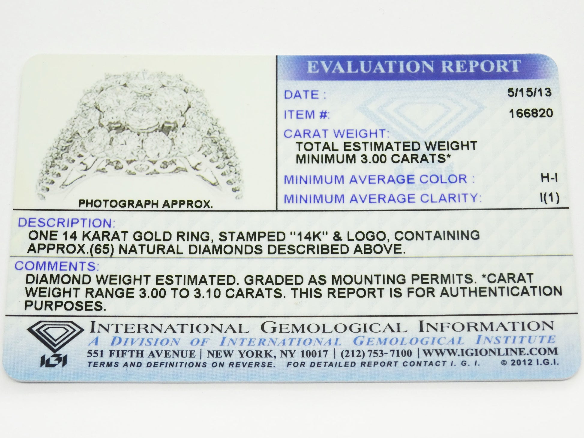Includes IGI evaluation report, dated 5/15/13. Diamond information was pulled from this document.