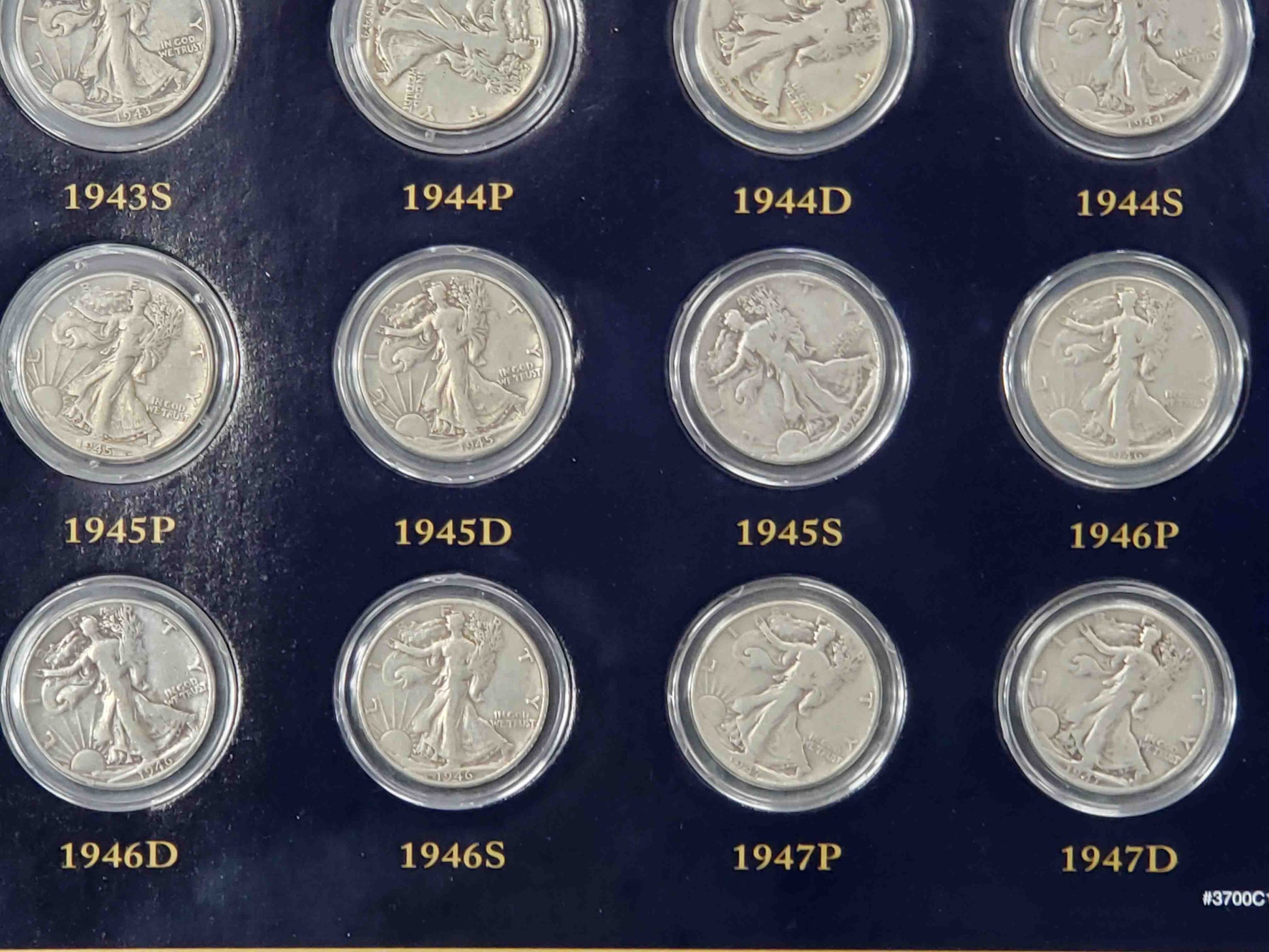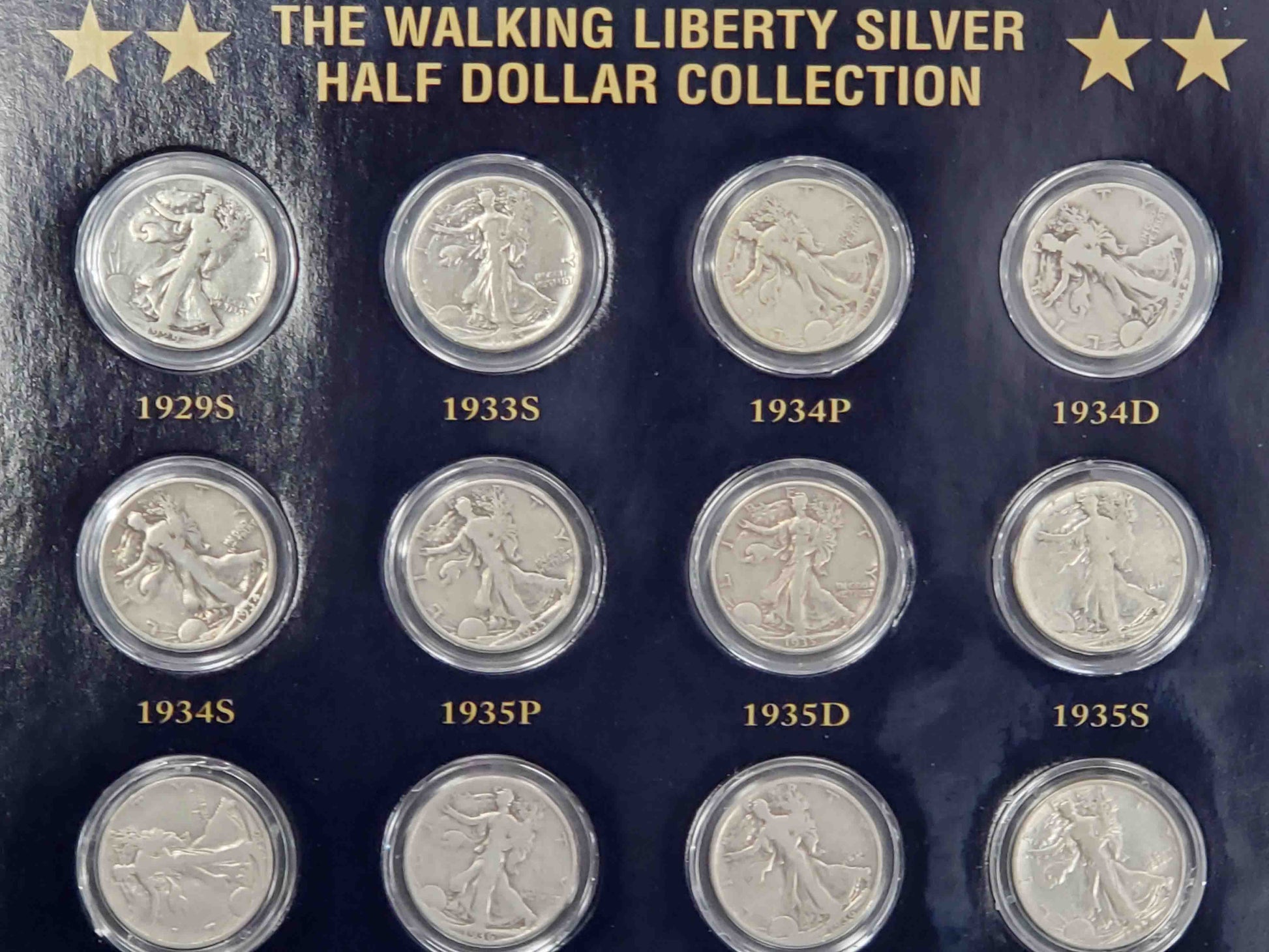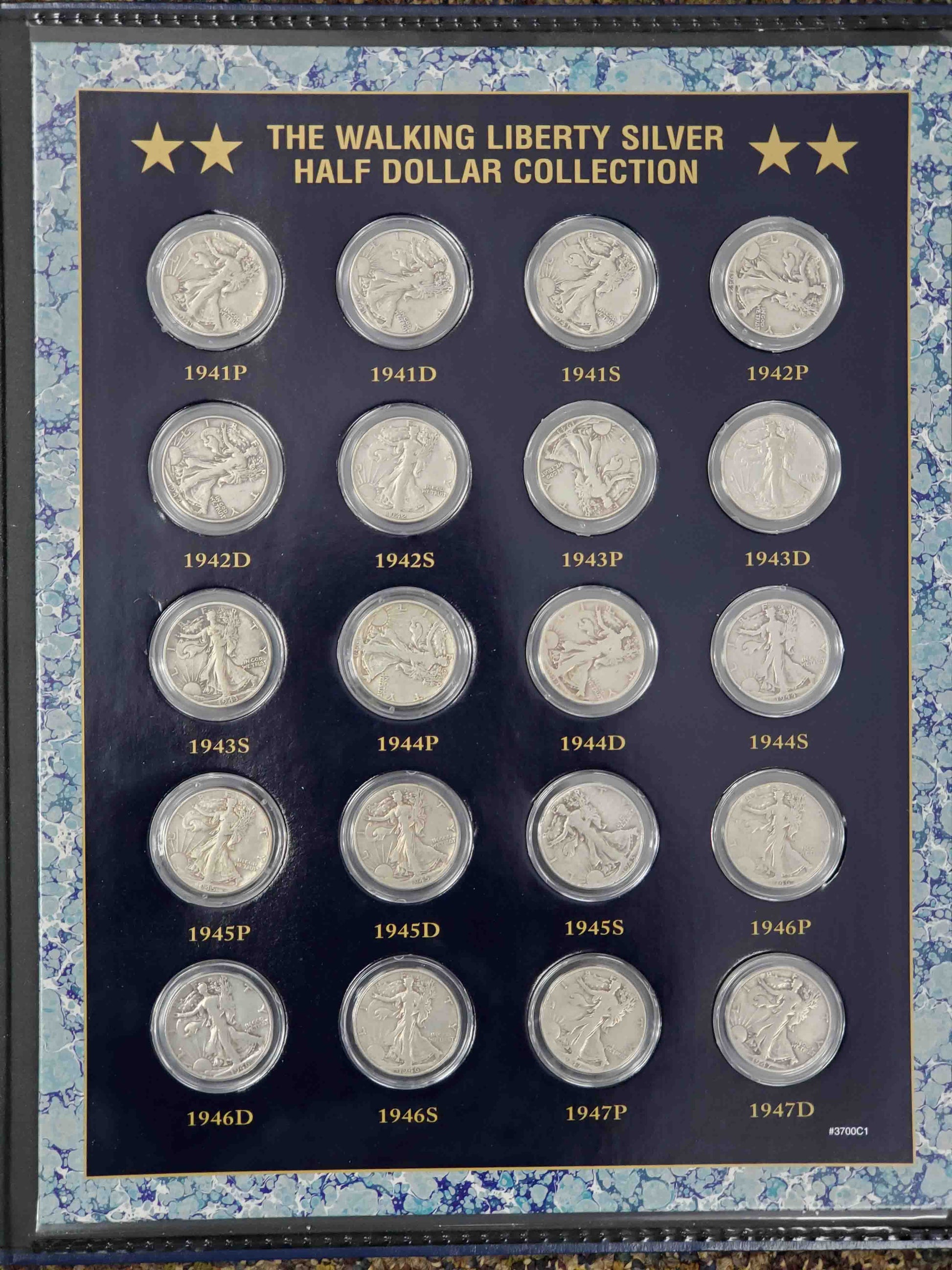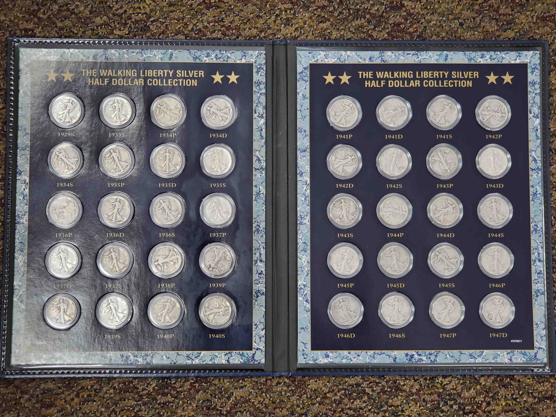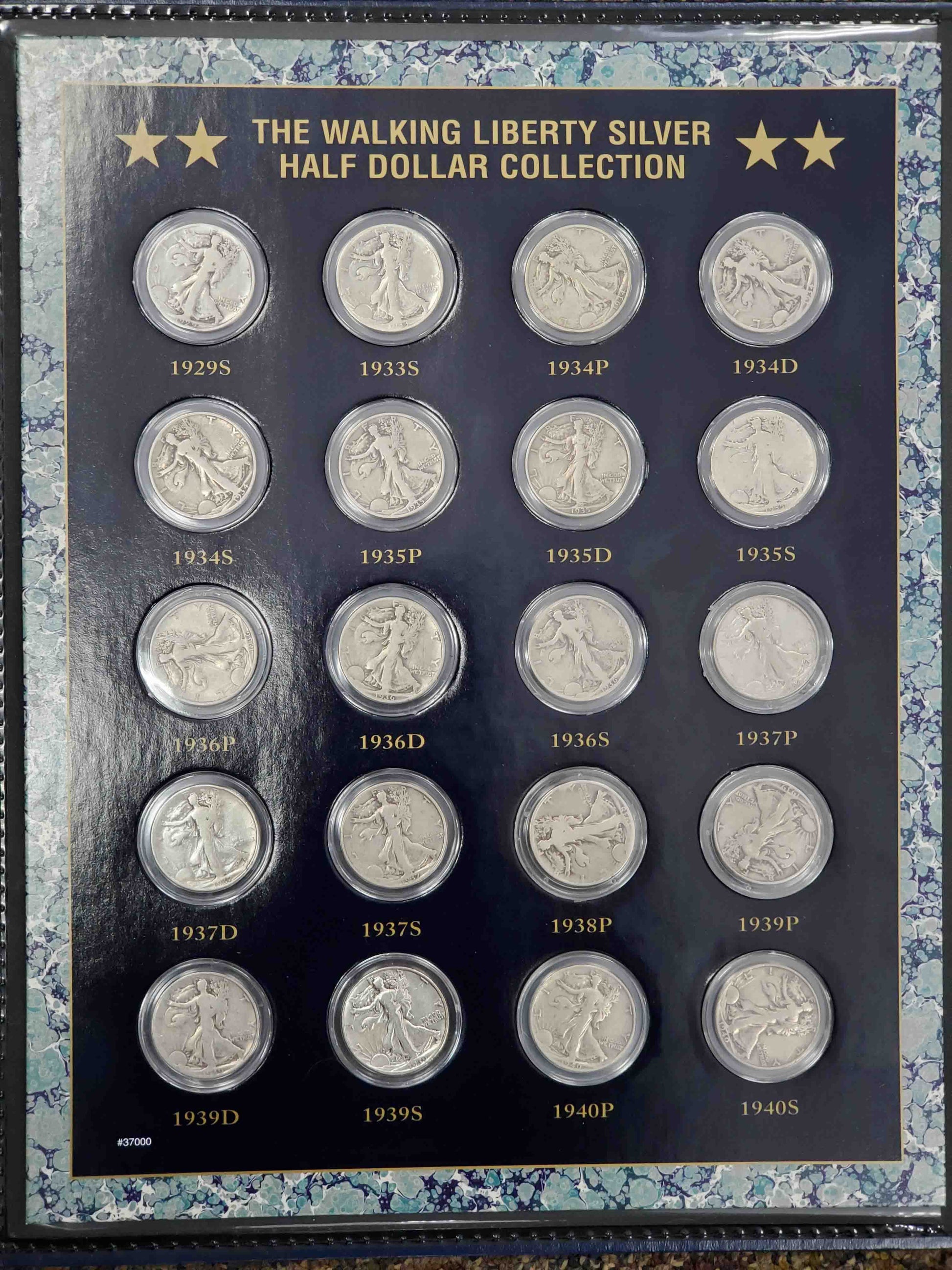 40 coins total in this complete collection of 90% silver Walking Liberty half dollars, minted between 1929 and 1947 from the Philadelphia, San Francisco and Denver U.S. Mints.