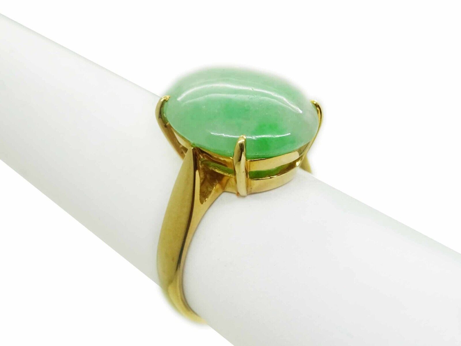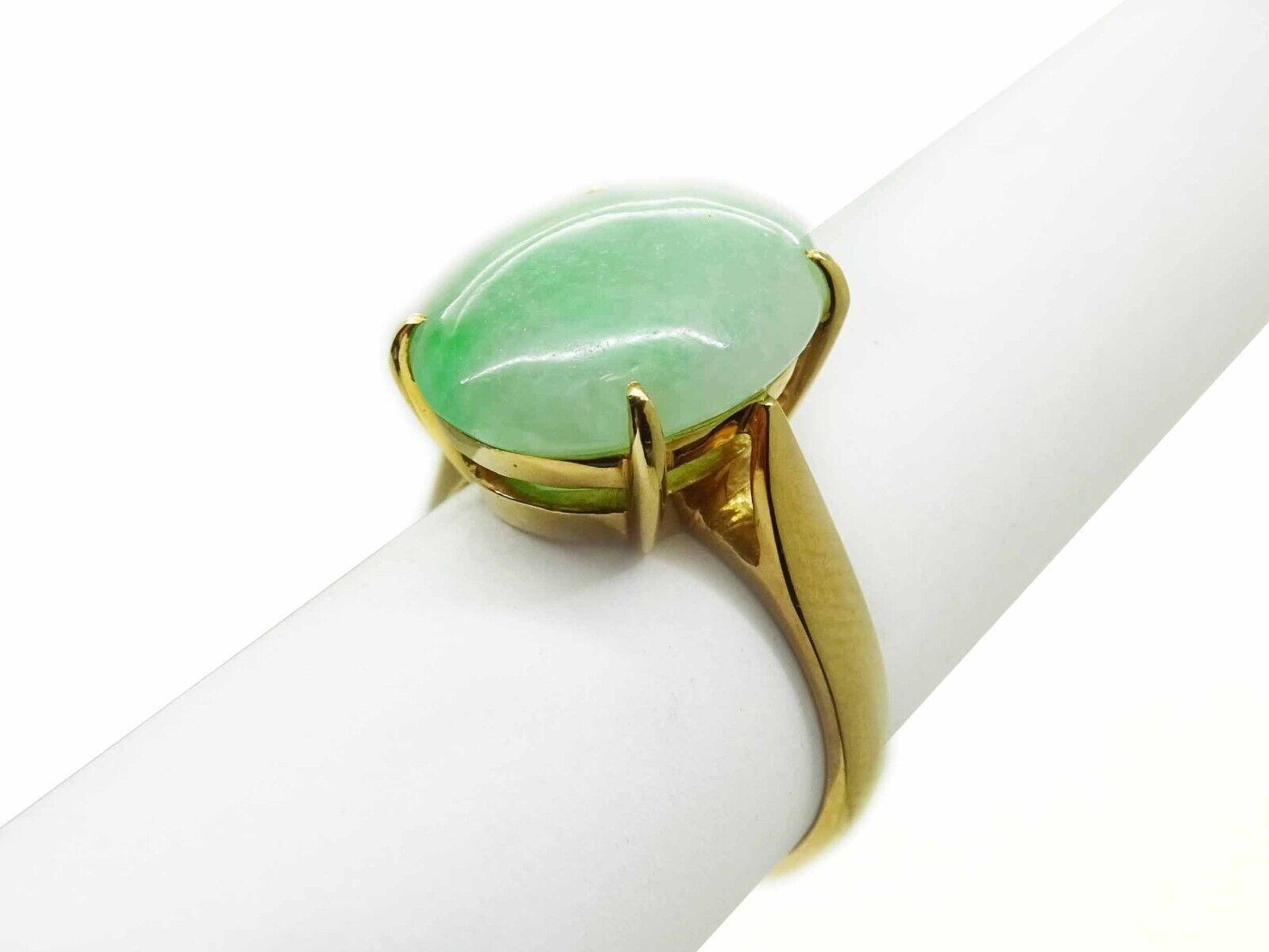 Beautiful light green jade with a couple of deep green spots, prong set in a fine filigree ring in 14k yellow gold.