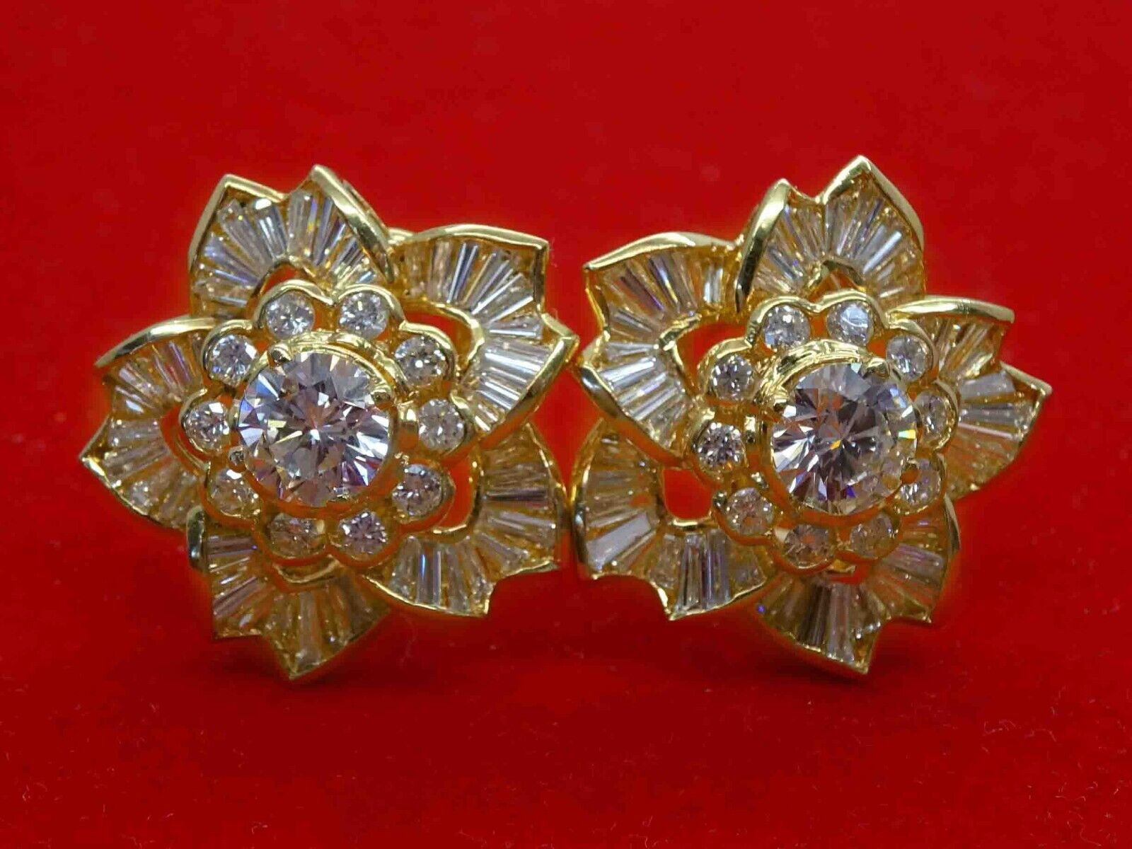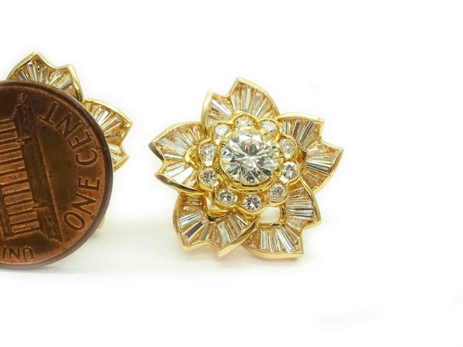 Pair of stunning diamond cluster burst omega clip earrings in 18k yellow gold.
