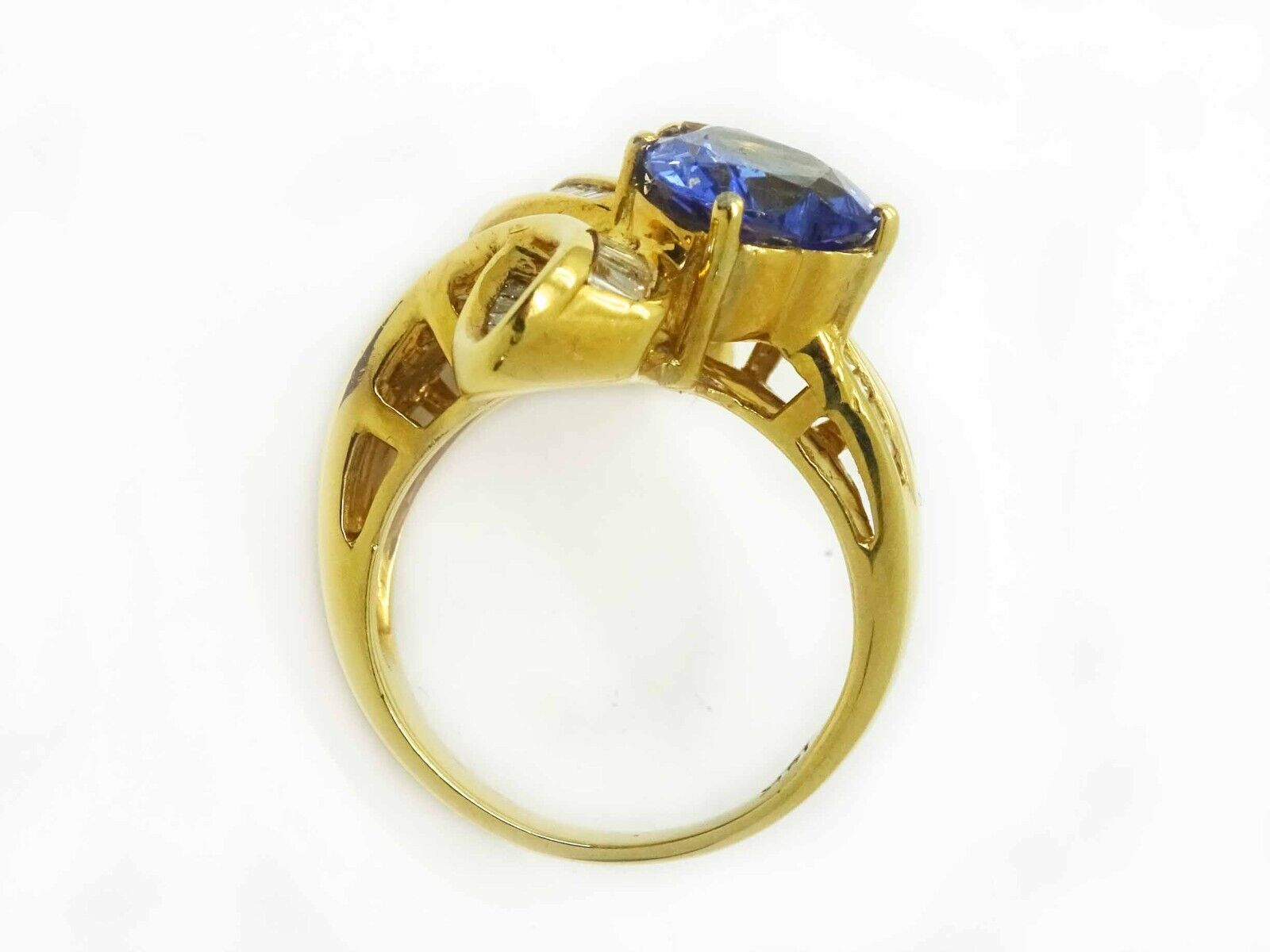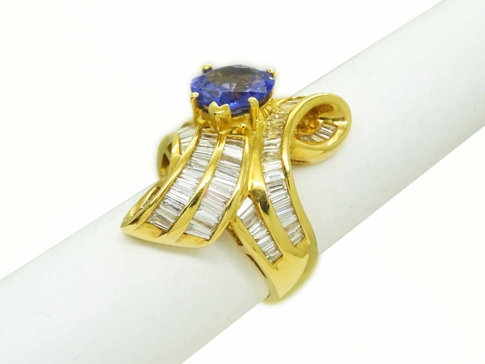 Ladies tanzanite & diamond 18k yellow gold cast and assembled bypass ribbon ring with bright polish finish.