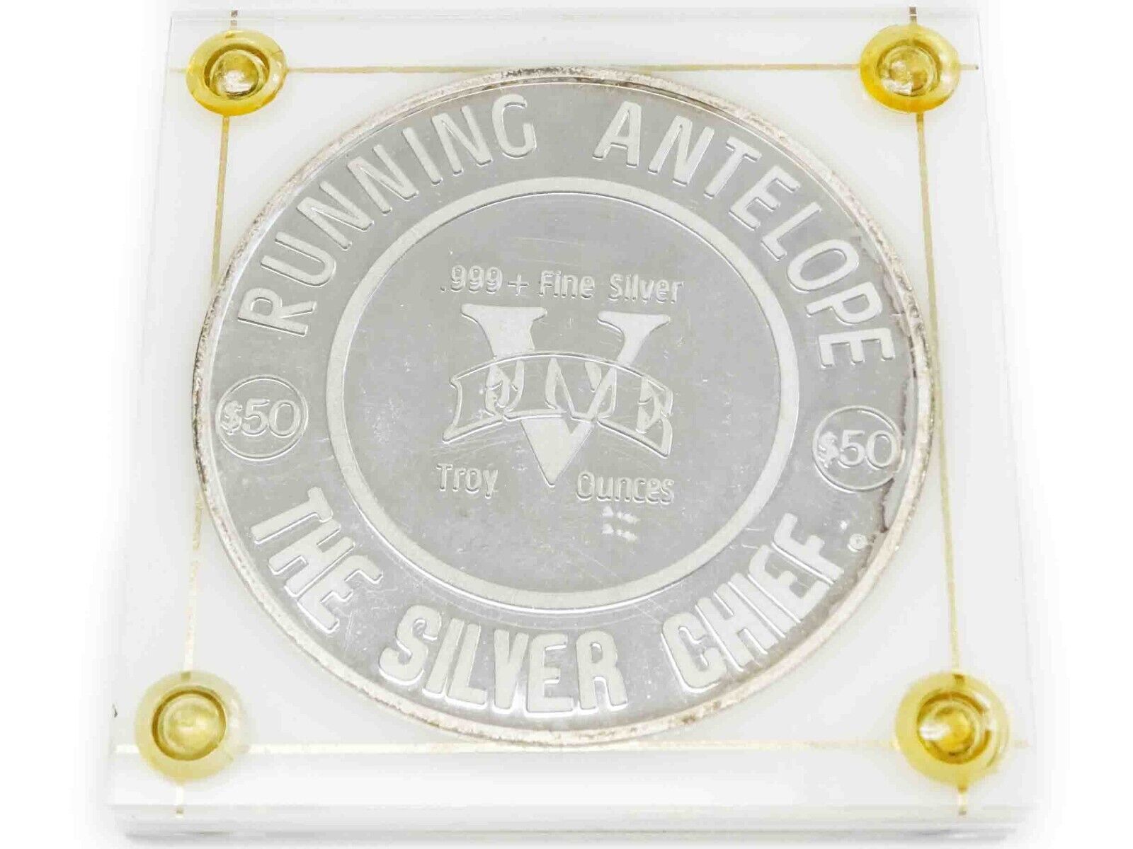 5 Troy Ounce .999 Fine Silver Round $50 Running Antelope The Silver Chief