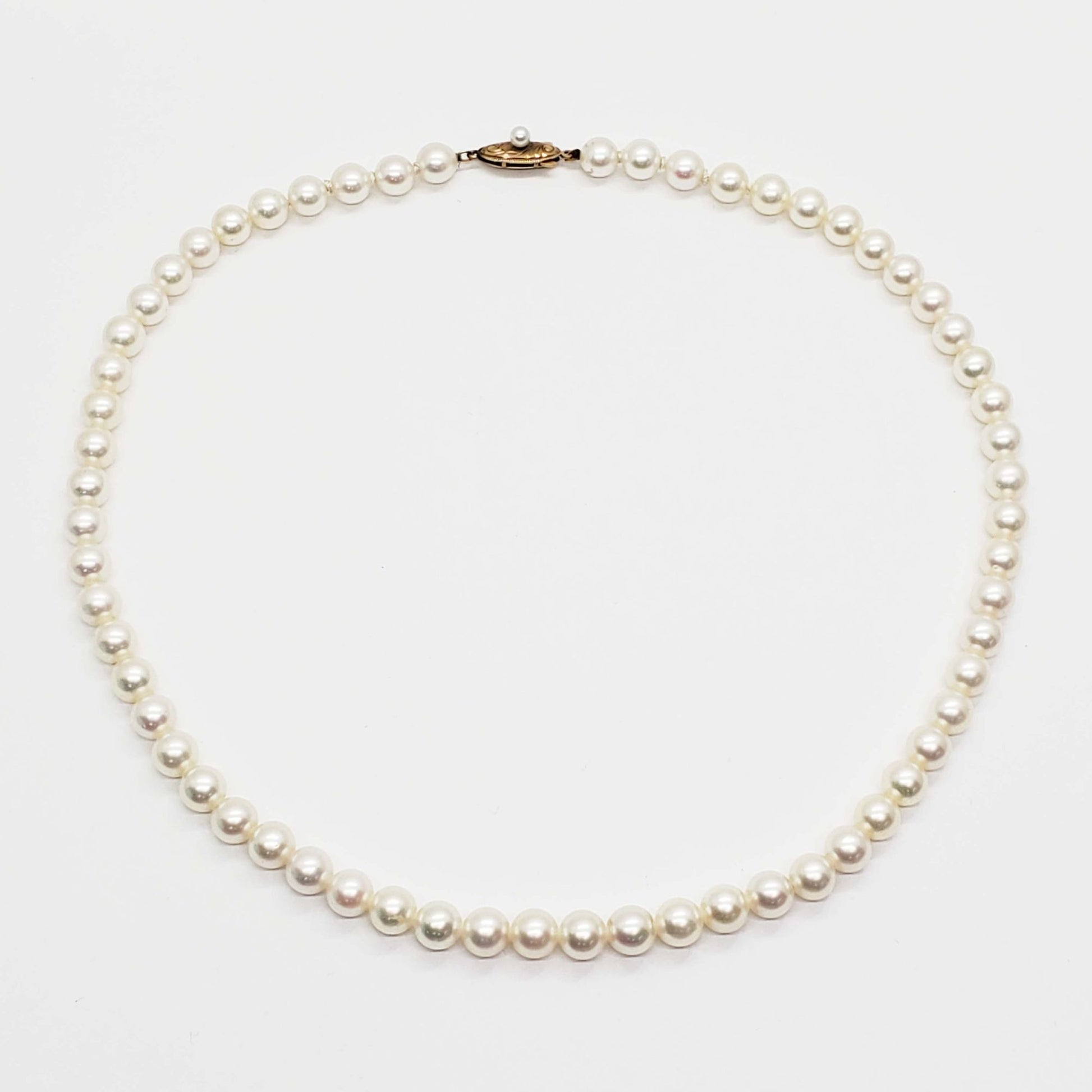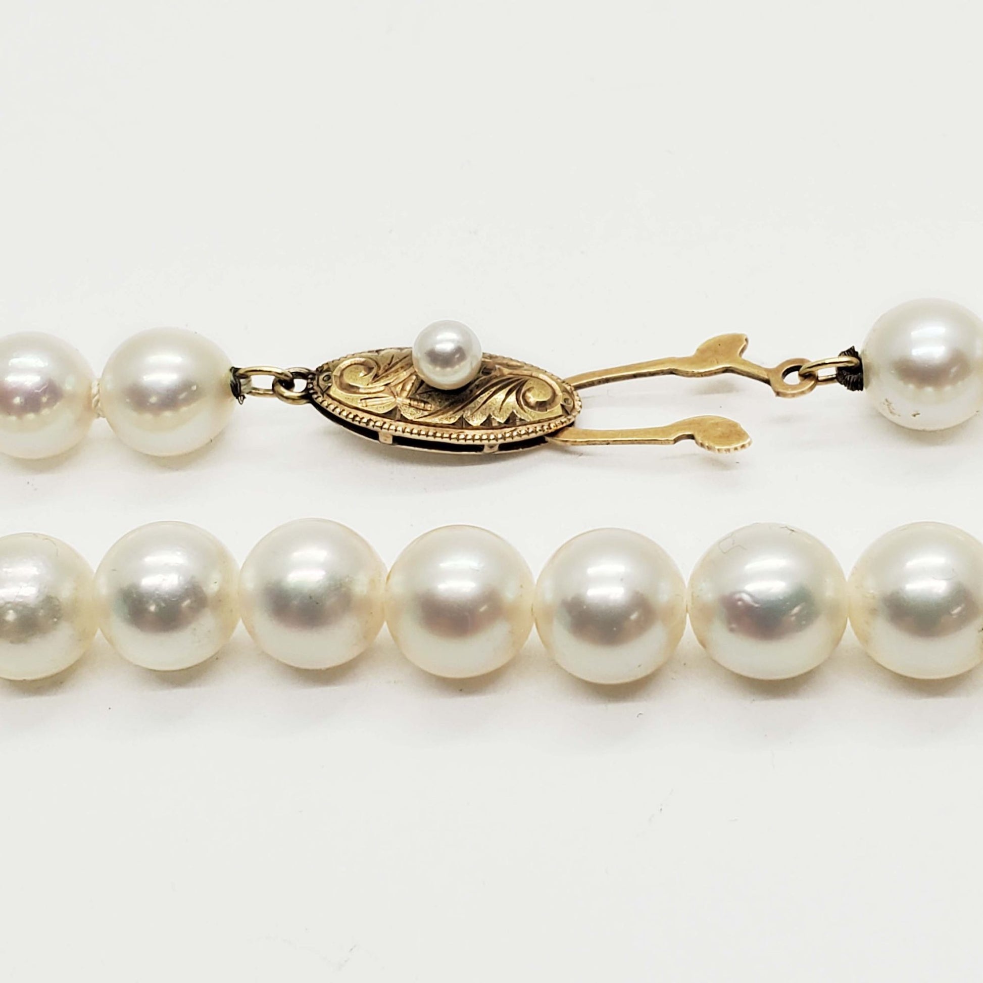 Fine cultured pearl bead strand necklace with 14k yellow gold clasp.