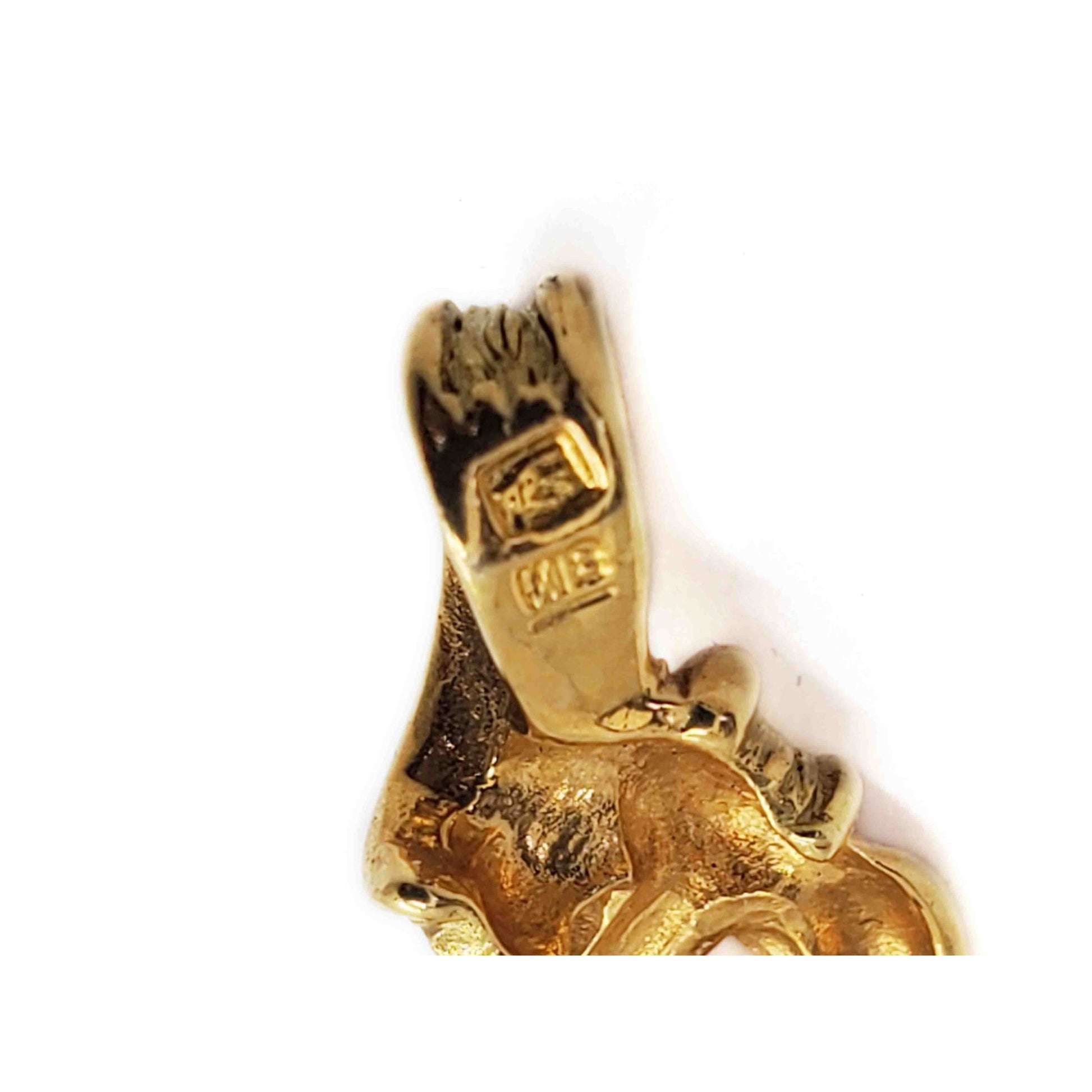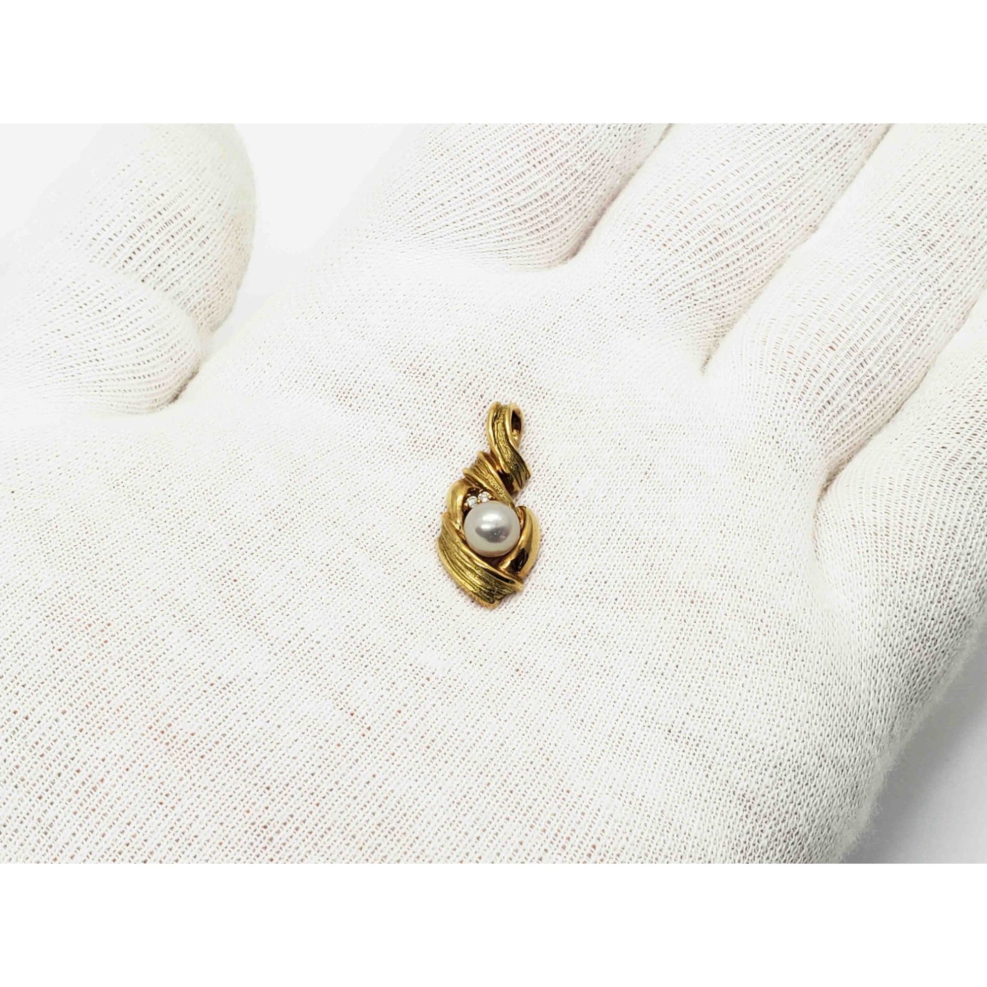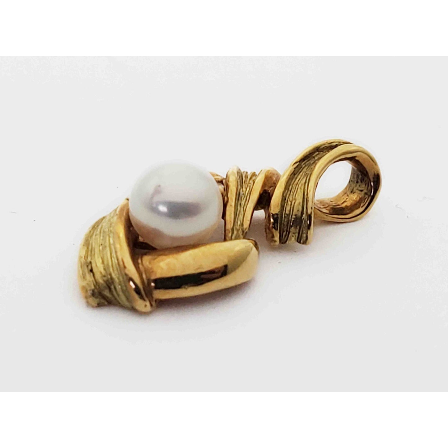 Pearl and diamond accent ribbon style pendant in 18k yellow gold.
