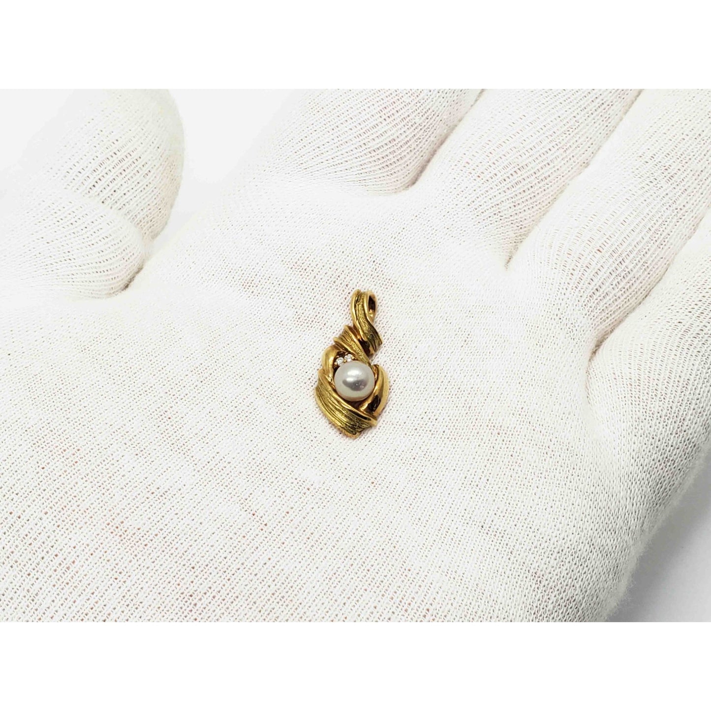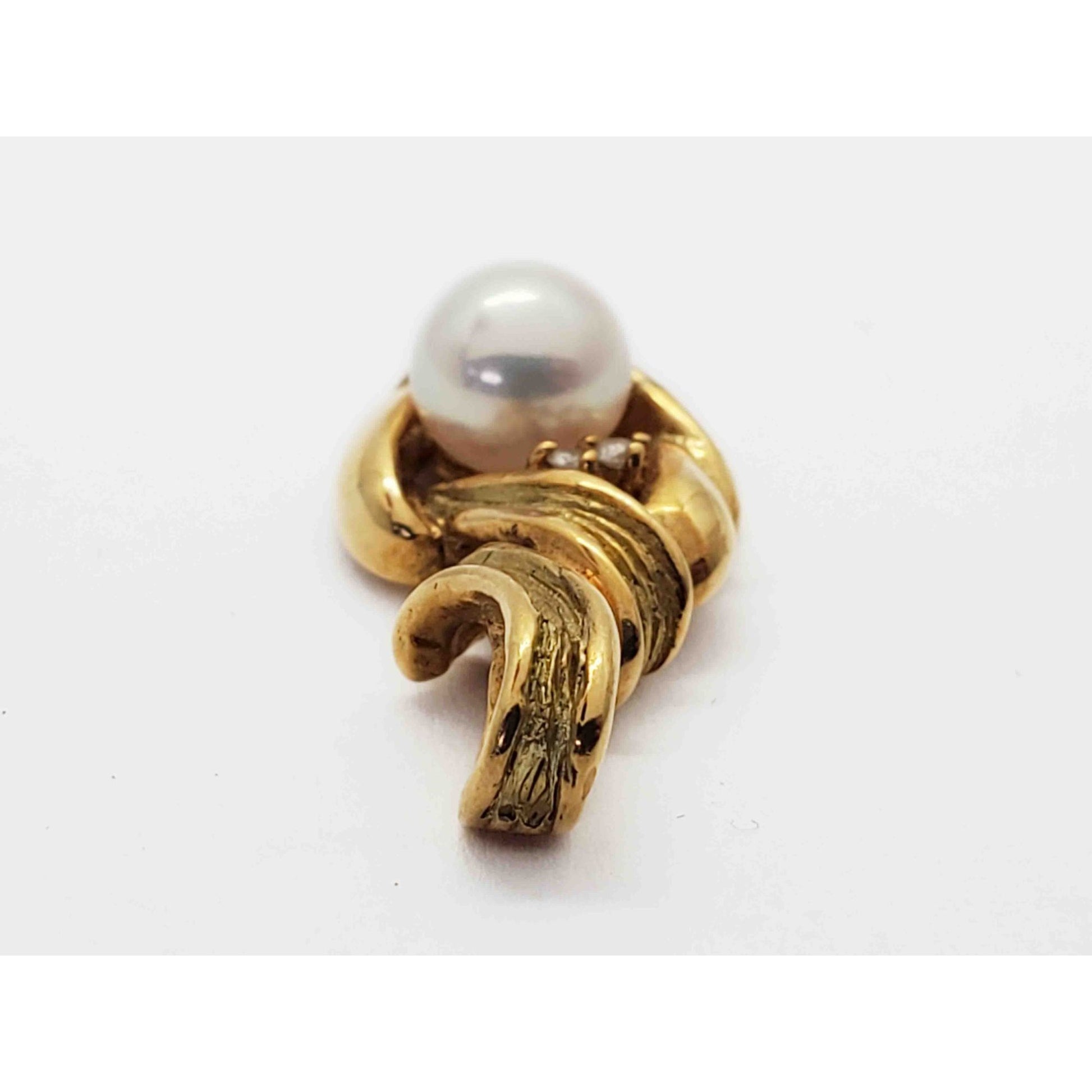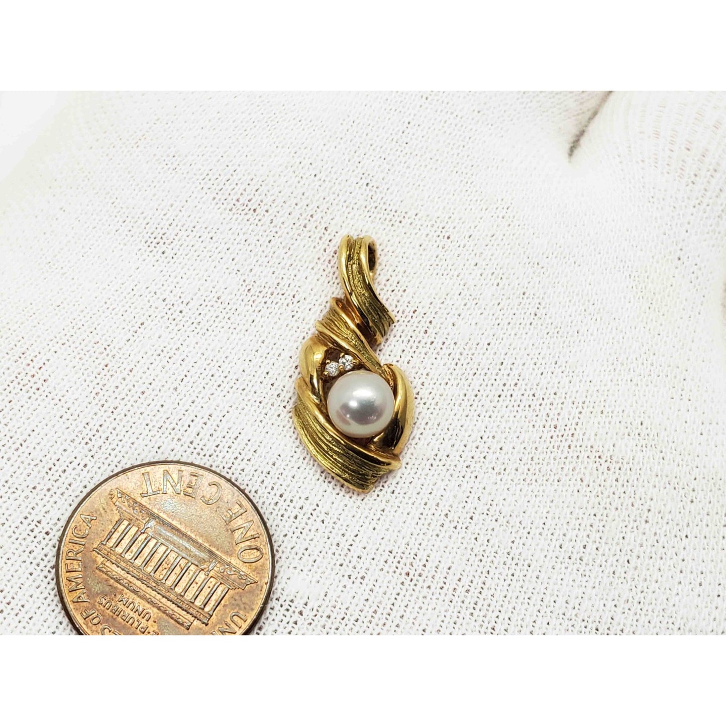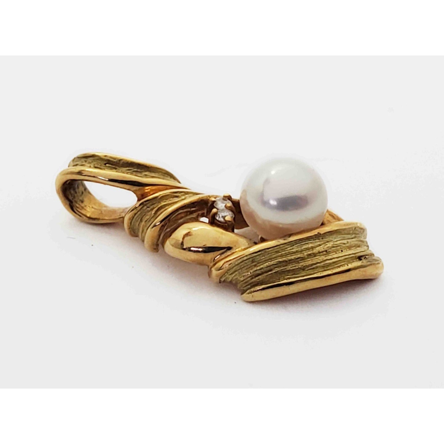 6mm Cultured Pearl & Natural Diamond Accent Ribbon Style Pendant 18k Gold