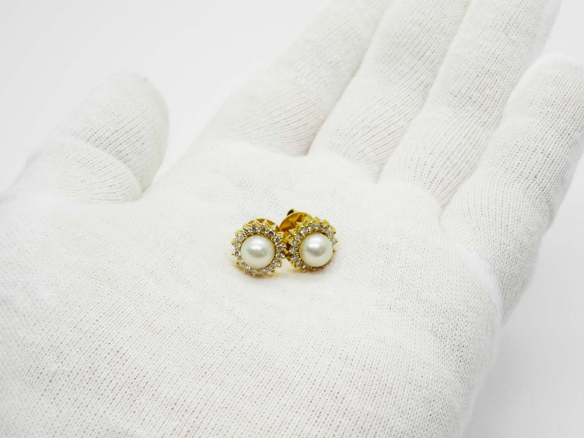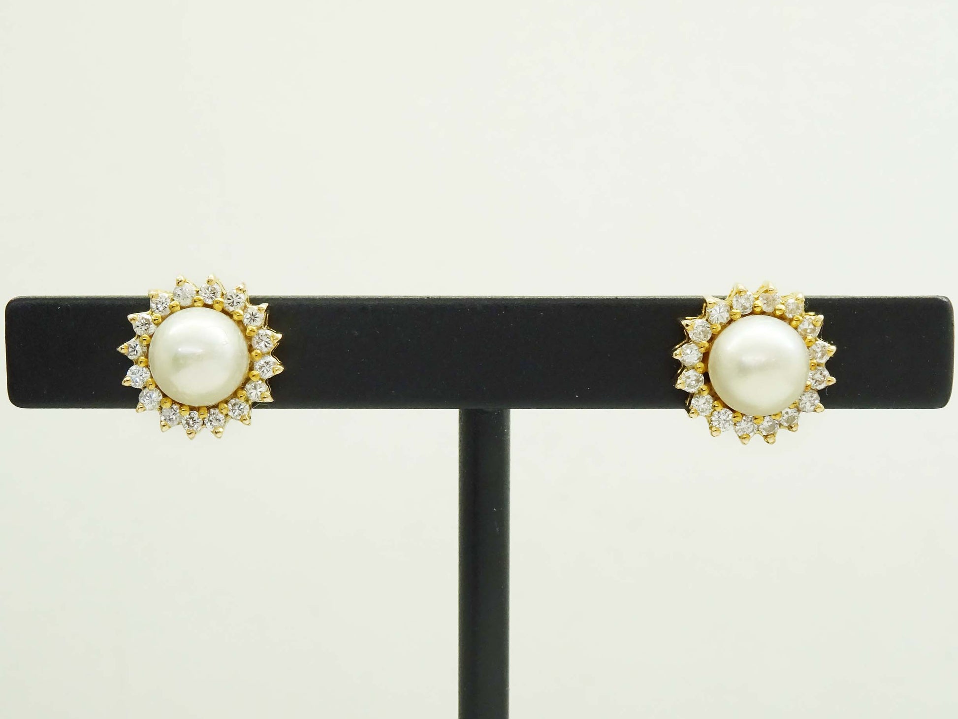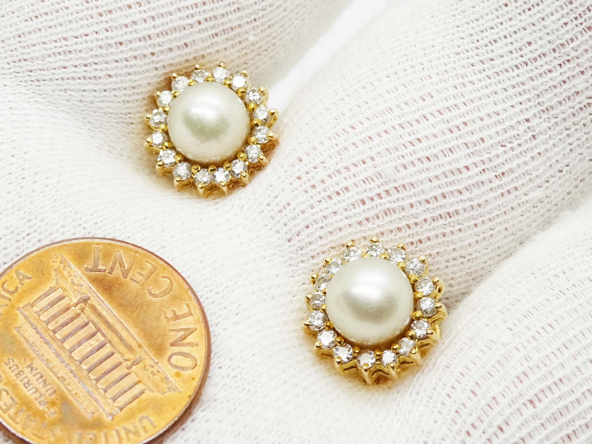 7mm Pearl Bead & Diamond Halo Burst Style Stud Earrings 14k Gold