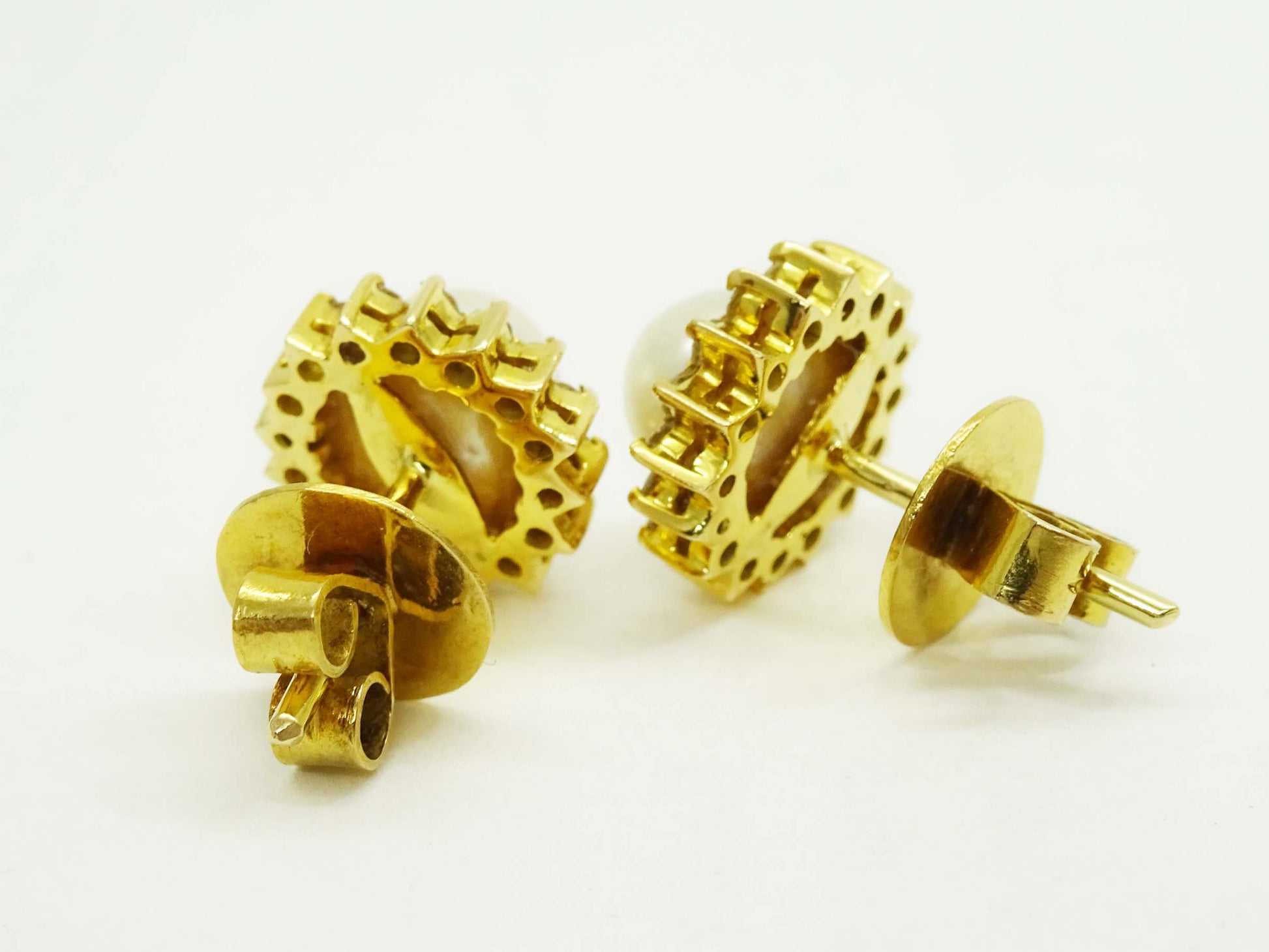 Pair of pearl bead and diamond halo burst style stud earrings in 14k yellow gold.