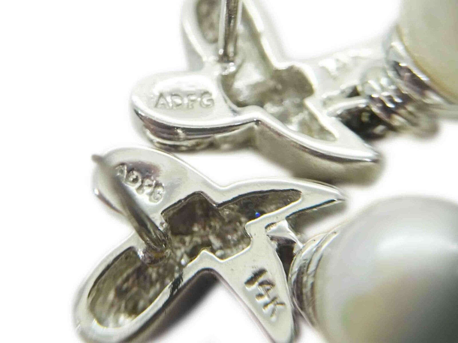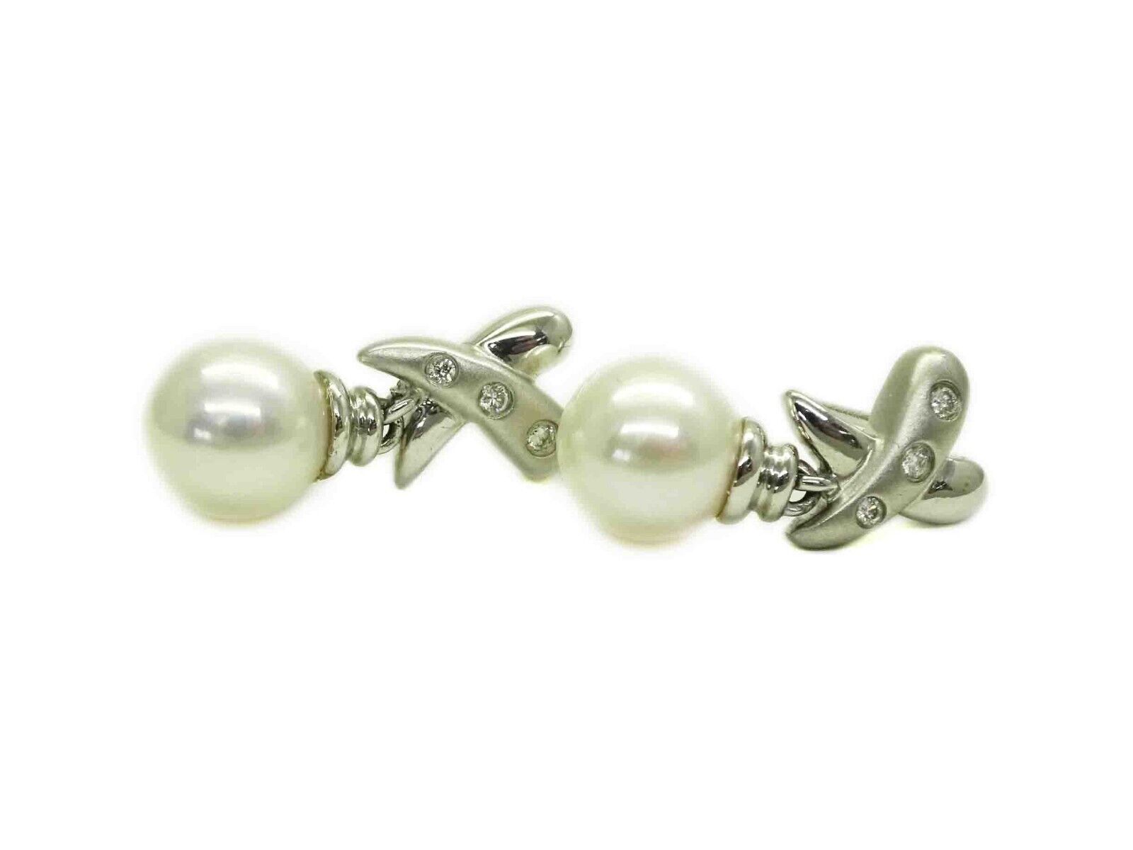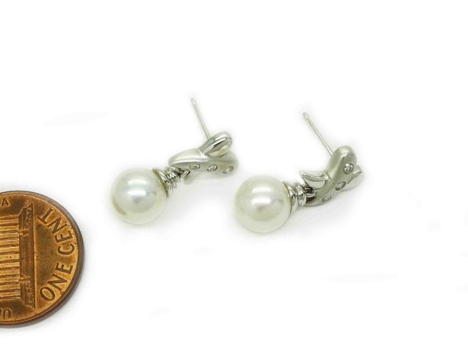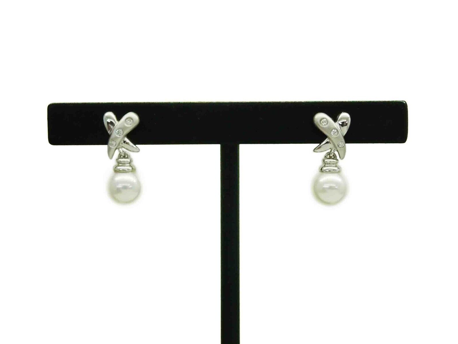Fine pair of pearl bead and diamond accent “X” drop earrings, in 14k white gold coated with a thin layer of palladium silver alloy for that extra white sparkle.