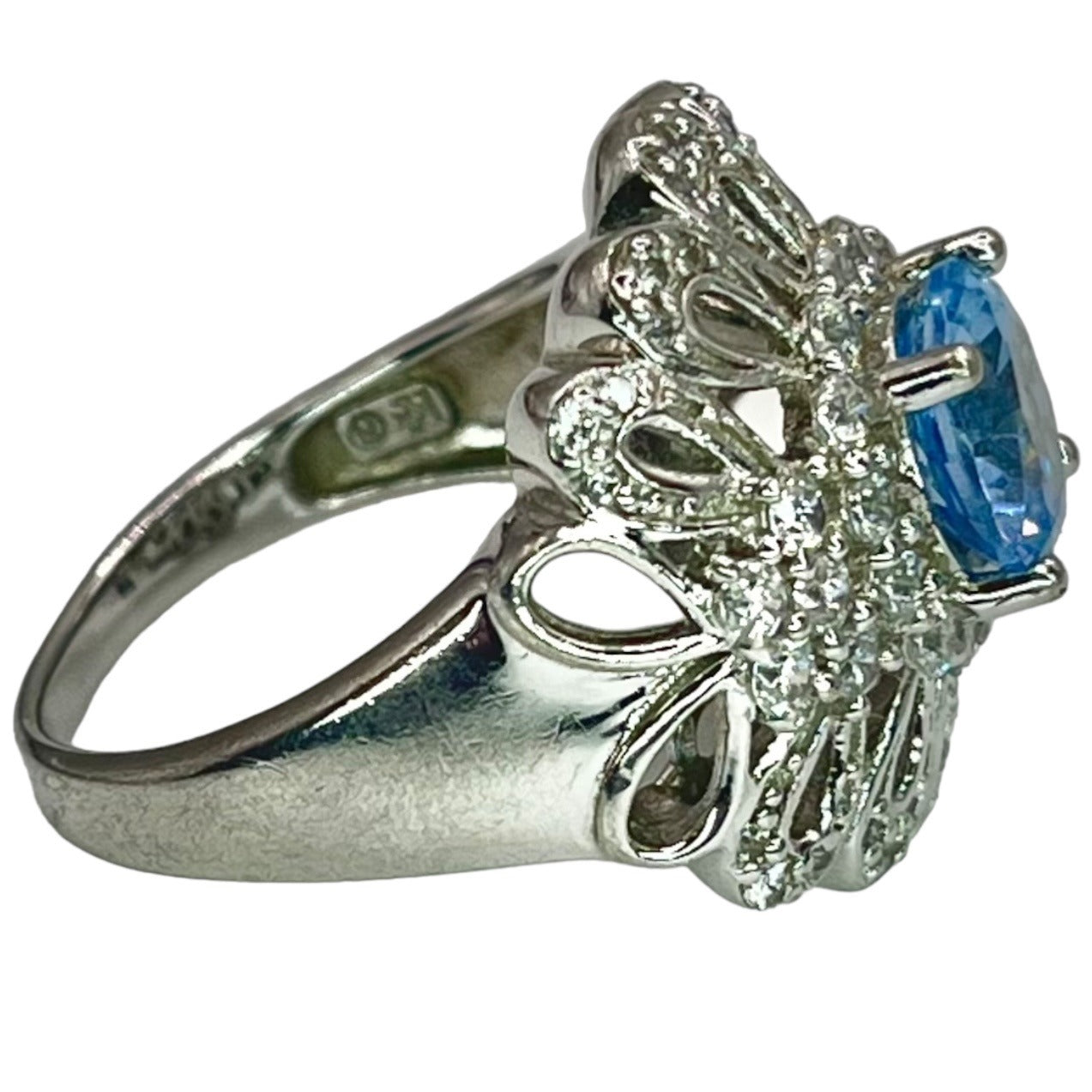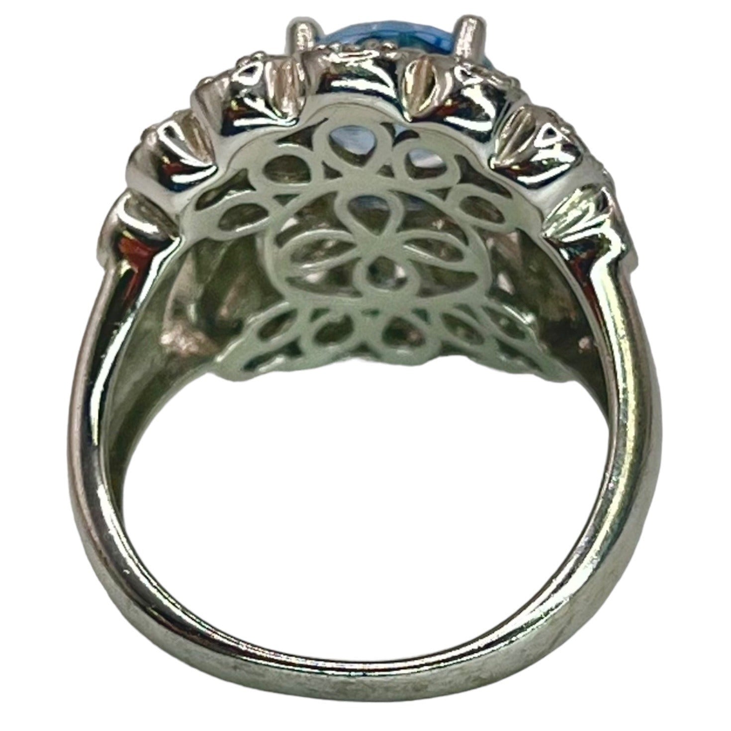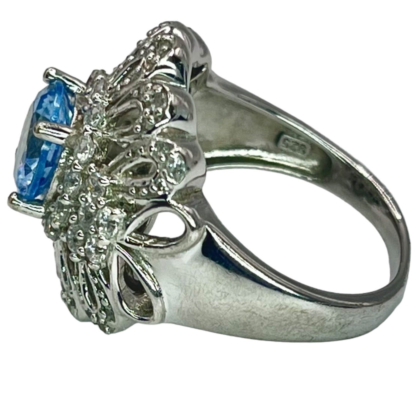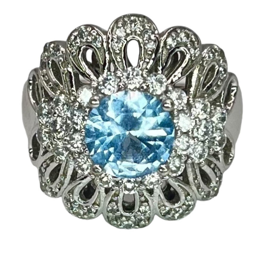 925 Sterling Silver Blue White CZ Accent Filigree Large Cocktail Ring Size 7.75